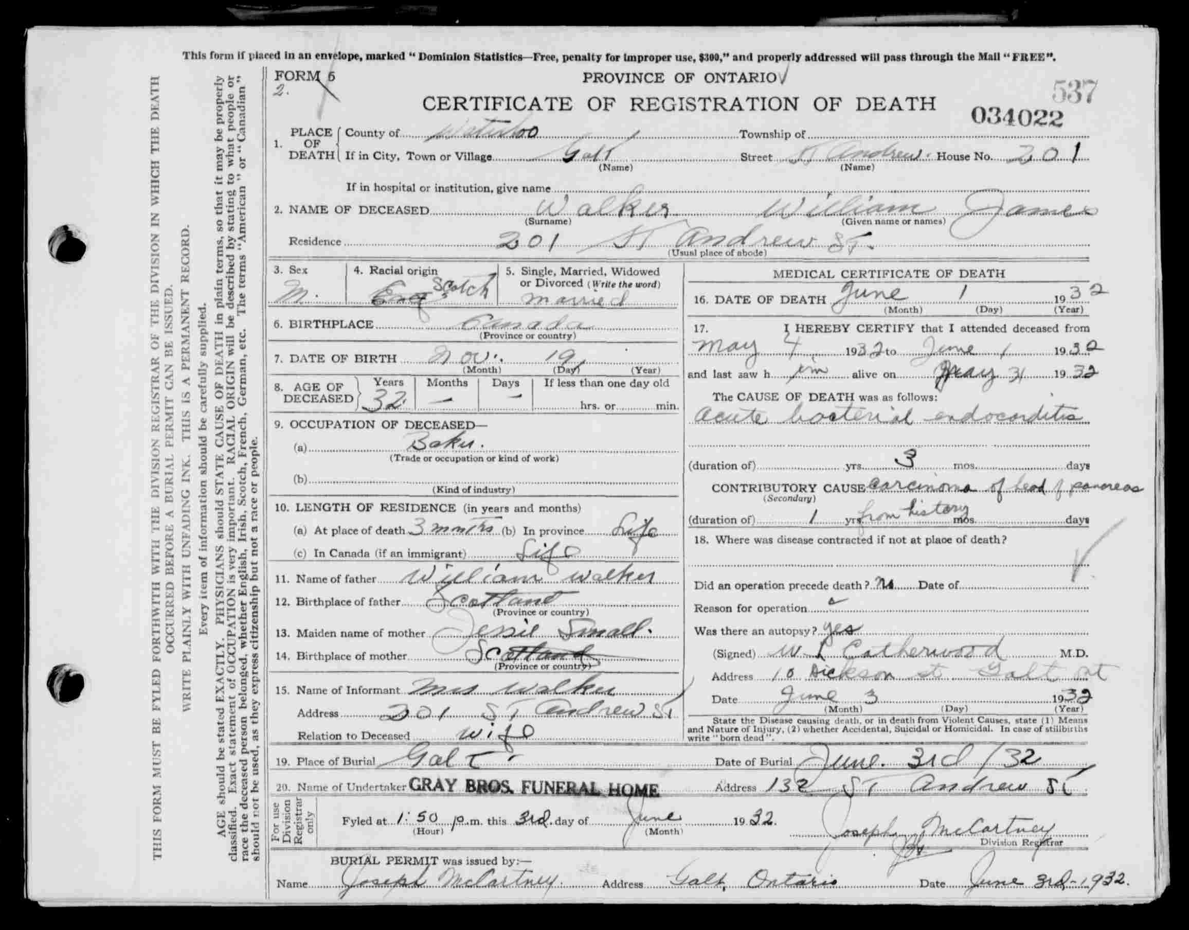 “Trade listed as Apprentice Telegraph Operator. DOB 21-11-97, born Oxford, Ontario. . 5 foot 4 inches. Hazel eyes, fair hair. Presbyterian. NOK Fred Walker, father. Jessie Walker, mother. Enlisted Galt 13-12-15 (age 18 years). Transferred from 111th Battalion to 153rd Battalion 23-9-16. Found as a Stowaway aboard SS Tuscania with 111th Battalion 13-10-16. Taken on Strength 18th Battalion 9-12-17. Shrapnel wounds to left side and head 5-6-18. Returned to unit 8-6-18. Applied for discharge in England, 28-5-19. Demobilized London, England 28-6-19. Returned on his own 17-7-20 aboard SS Caronia, Halifax, N.S. Ontario Death Records, died 1-6-32, acute bacterial endocorditis, contributing factor carcinoma of pancreas. Burial confirmed Mountview Cemetery, Cambridge (Galt) 31E-47-2. Headstone photo courtesy B. Gilbert. Death Records indicate birth occurred 1900.