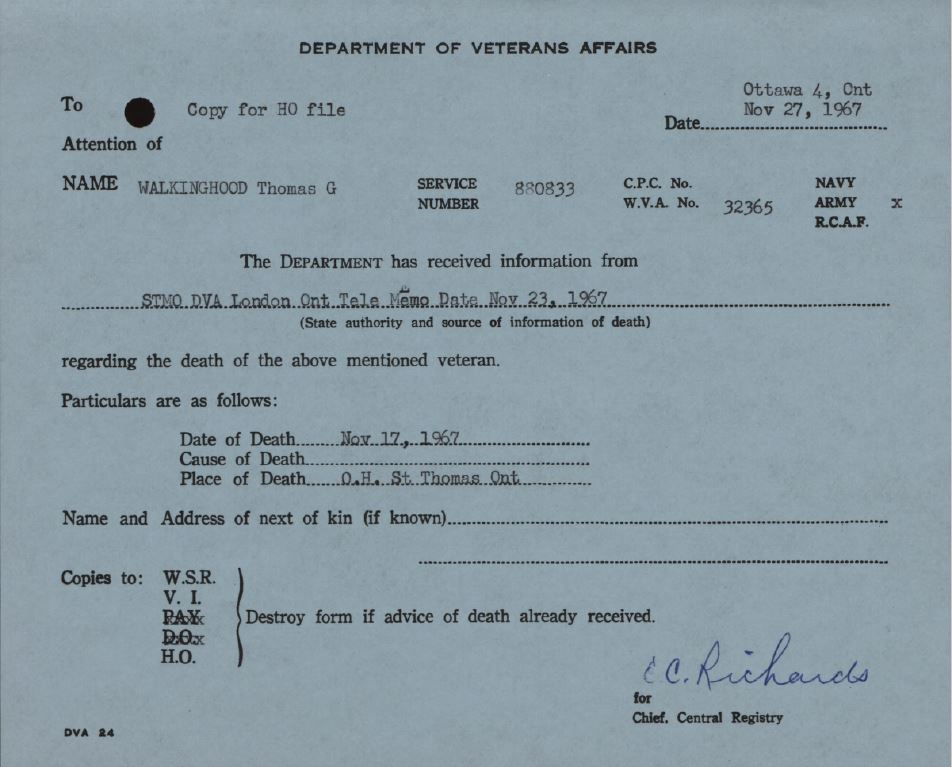 Family Search: When Private Thomas Gordon Walkinghood was born on 9 January 1883, in Reed City, Osceola, Michigan, United States, his father, Christopher Walkinghood, was 31 and his mother, Margaret Miller, was 21. He married Lavina Dodman on 18 June 1919, in Thamesville, Kent, Ontario, Canada. They were the parents of at least 1 son and 3 daughters. He immigrated to Canada in 1897 and lived in Bothwell, Kent, Ontario, Canada in 1901 and Thamesville, Kent, Ontario, Canada for about 6 years. He registered for military service in 1916. In 1916, at the age of 33, his occupation is listed as mechanic in Thamesville, Kent, Ontario, Canada. He died on 17 November 1967, in St. Thomas, Elgin, Ontario, Canada, at the age of 84, and was buried in Thamesville, Chatham-Kent, Ontario, Canada.