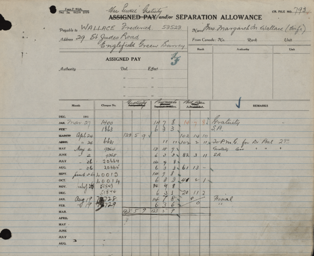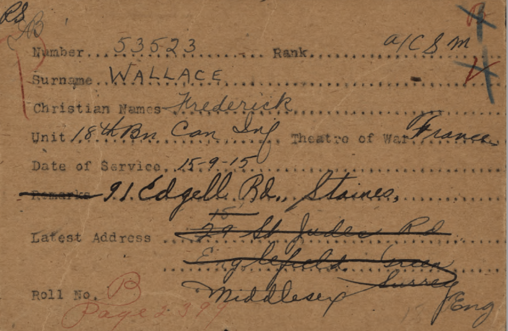 Family Search: When Private Frederick George Wallace was born on 23 May 1896, in Finchley, Barnet, London, England, United Kingdom, his father, Ernest Ward Wallis, was 23 and his mother, Naomi Brooker, was 24. He married H. Wallace in 1918, in England, United Kingdom. He immigrated to Canada in 1913 and lived in Alton, Hampshire, England, United Kingdom in 1901 and Staines, Middlesex, England, United Kingdom in 1921. He registered for military service in 1914. In 1914, at the age of 18, his occupation is listed as farmer in Ontario, Canada. He died on 18 April 1933, in London, England, United Kingdom, at the age of 36.