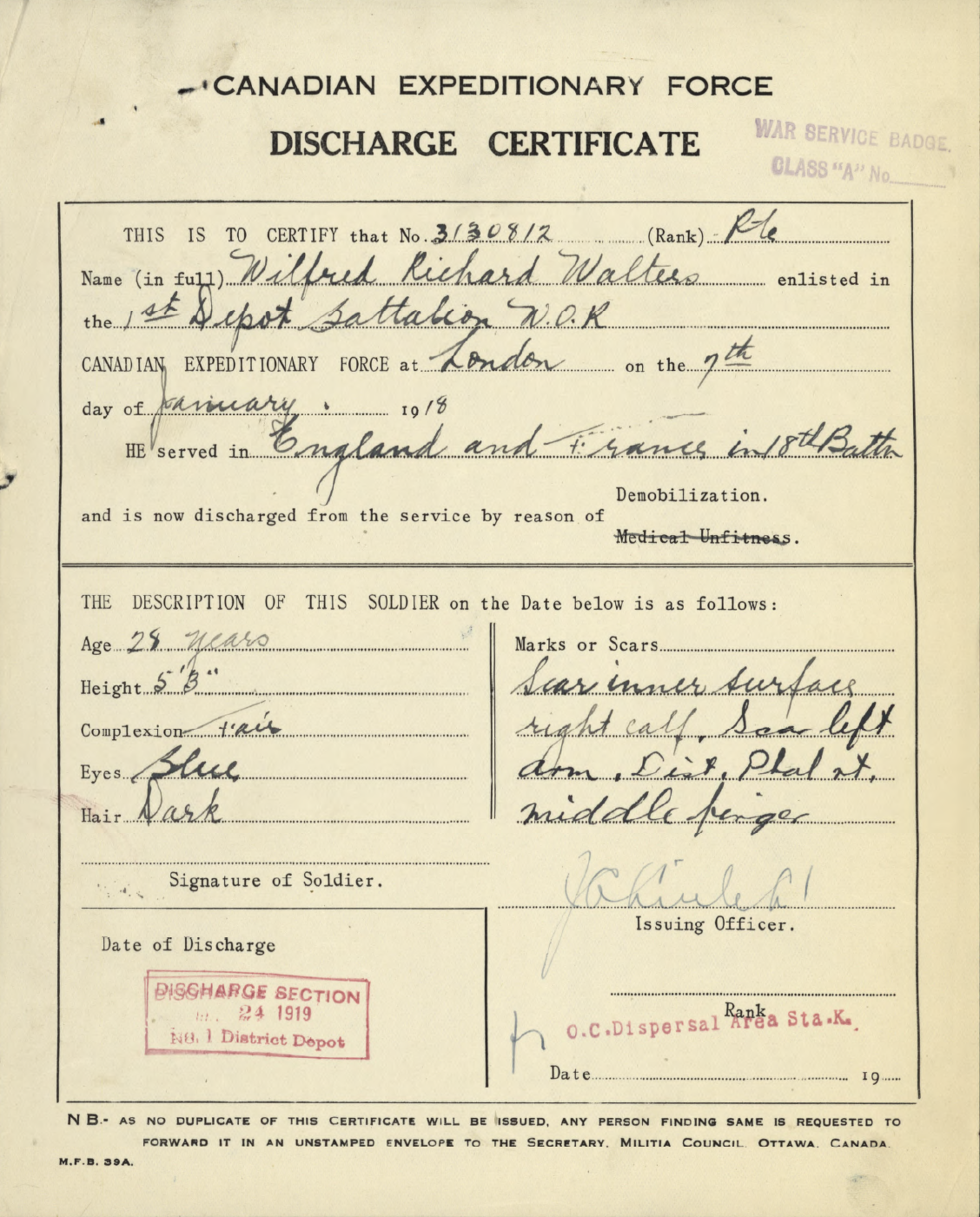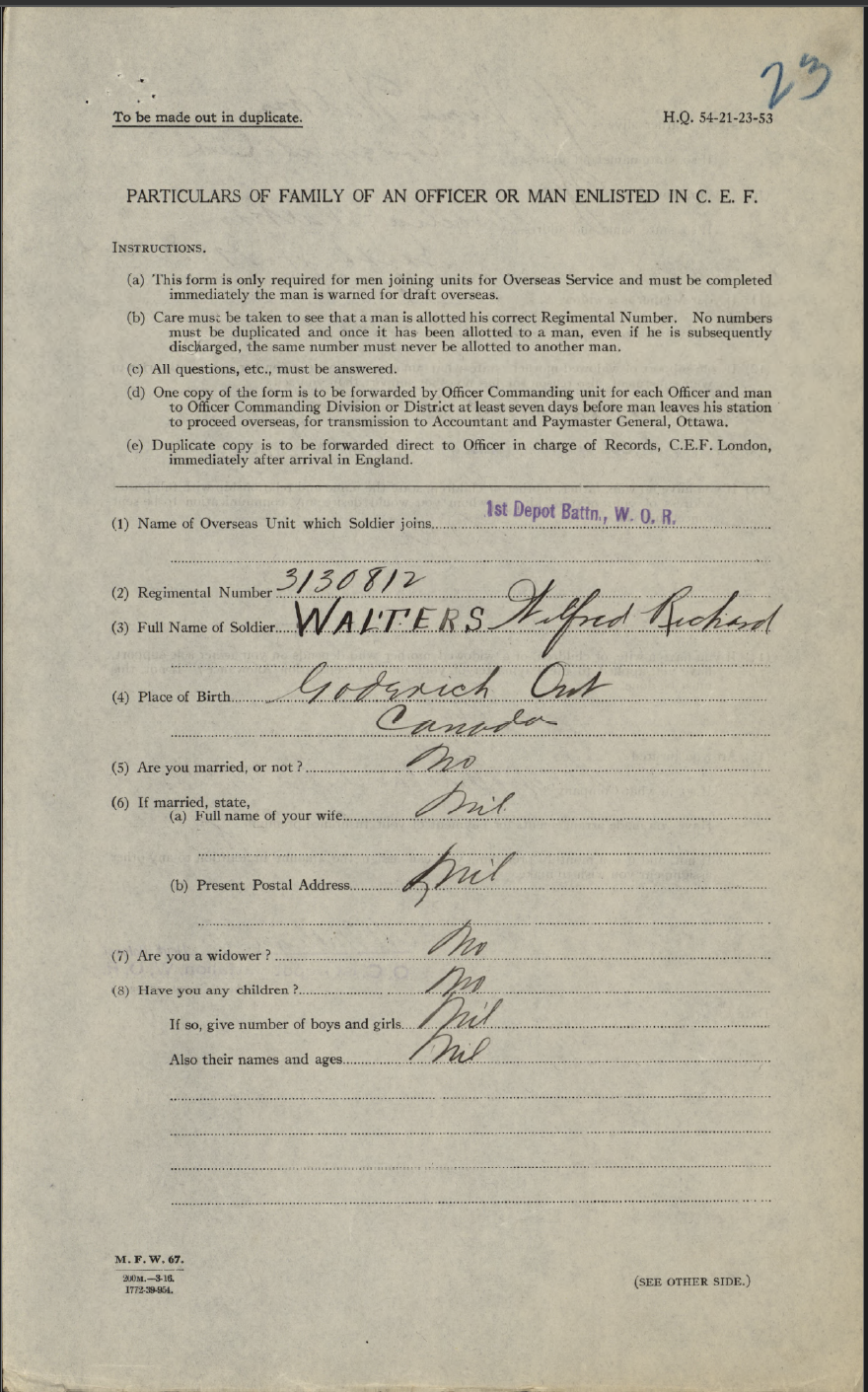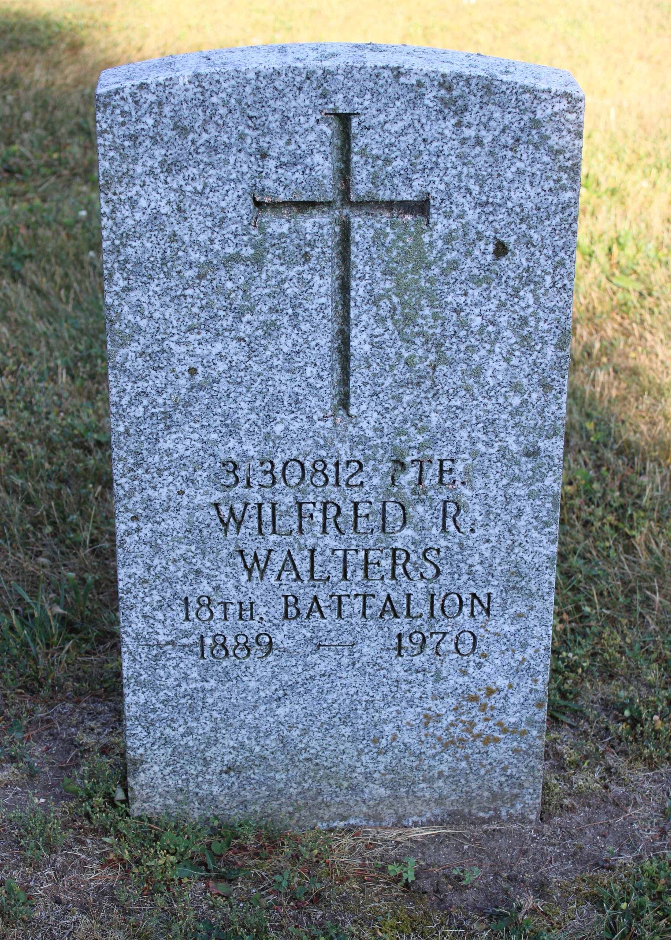 Family Search: When Private Wilfred Richard Walters was born on 12 July 1889, in Goderich, Huron, Ontario, Canada, his father, James Walters, was 45 and his mother, Amelia Queenie Hiney, was 29. He lived in Huron, Ontario, Canada for about 10 years. He registered for military service in 1918. In 1918, at the age of 29, his occupation is listed as labourer in Goderich, Huron, Ontario, Canada. He died in 1970, at the age of 81, and was buried in Maitland Cemetery, Goderich, Huron, Ontario, Canada.