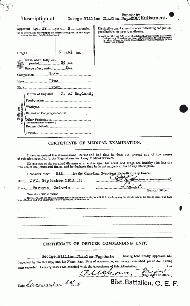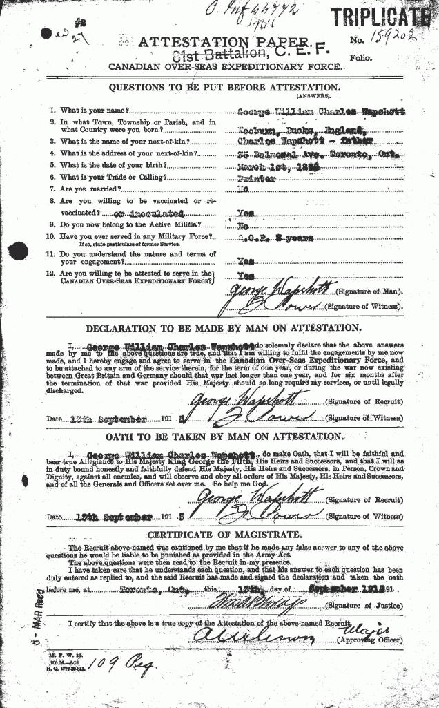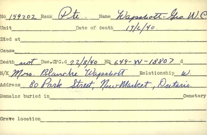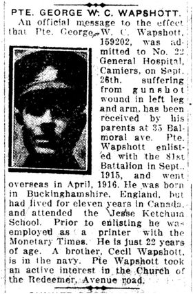 Wapshott, George William Charles: Service no. 159202 Digitized Service Record Source: Per news clipping post by David Archer at 18th Battalion Facebook Page (not group). Find-A-Grave Wapshott, George William Charles: Service no. 159202. Source: Toronto Telegram. October 1918. Per news clipping post by David Archer at 18th Battalion Facebook Page (not group). Share this: Click to email a link to a friend (Opens in new window) Email Click to share on Facebook (Opens in new window) Facebook Click to share on X (Opens in new window) X Click to share on Reddit (Opens in new window) Reddit Click to share on LinkedIn (Opens in new window) LinkedIn Click to print (Opens in new window) Print Click to share on Tumblr (Opens in new window) Tumblr Click to share on Pocket (Opens in new window) Pocket Click to share on Pinterest (Opens in new window) Pinterest Click to share on Telegram (Opens in new window) Telegram Click to share on WhatsApp (Opens in new window) WhatsApp Like Loading...