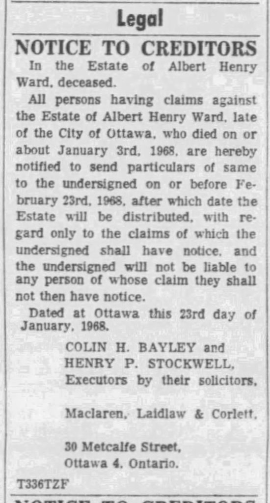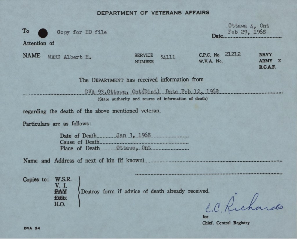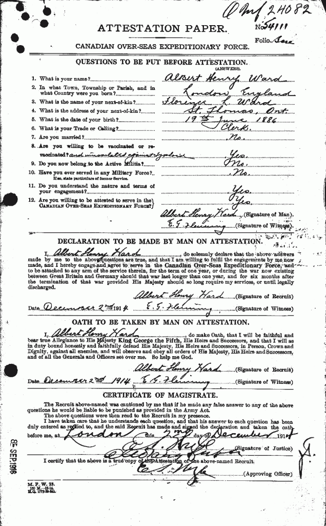 Family Search: When Private Albert Henry Ward was born on 19 January 1886, in Lee St Margaret, Kent, England, United Kingdom, his father, Albert James Ward, was 32 and his mother, Florence Lucy Burnand, was 29. He immigrated to Canada in 1913 and lived in Lee, Lewisham, London, England, United Kingdom in 1901 and St. Thomas, Elgin, Ontario, Canada in 1922. He registered for military service in 1914. In 1914, at the age of 28, his occupation is listed as clerk. He died on 3 January 1968, in Ottawa, Carleton, Ontario, Canada, at the age of 81, and was buried in St. Thomas Cemetery, St. Thomas, Elgin, Ontario, Canada.