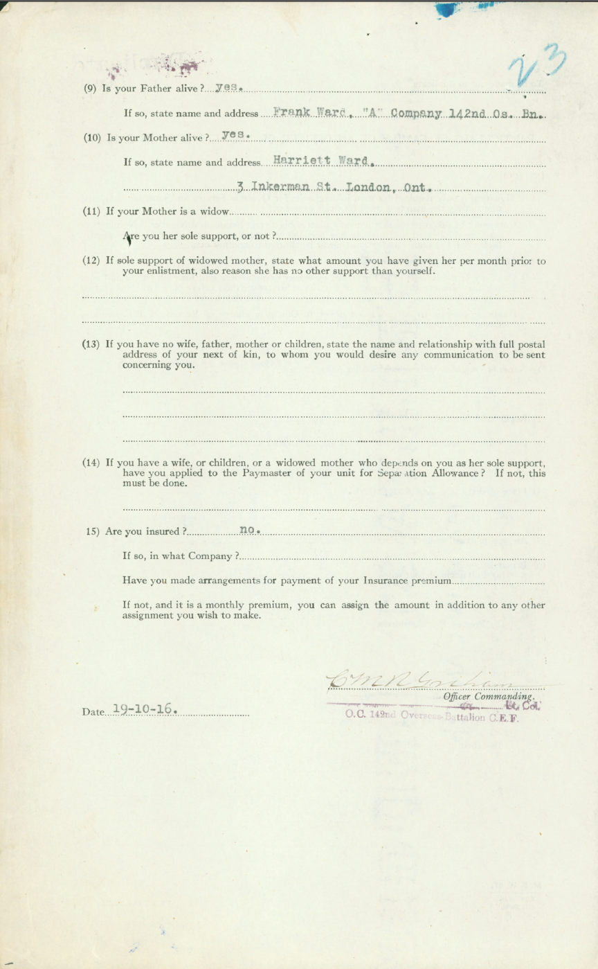Family Search: When Private Otto Franklin Ward was born on 2 December 1898, in London, Ontario, Canada, his father, Franklin Ernest Ward, was 24 and his mother, Harriet Knee, was 22. He married Margaret Elizabeth Mitchell on 22 September 1934, in London, Ontario, Canada. They were the parents of at least 3 sons and 2 daughters. He lived in Ontario, Canada in 1898. He registered for military service in 1915. In 1915, at the age of 17, his occupation is listed as labourer in London, Ontario, Canada. He died on 10 November 1982, in London, Ontario, Canada, at the age of 83, and was buried in Christ Church Anglican Cemetery, Lakeside, Oxford, Ontario, Canada.