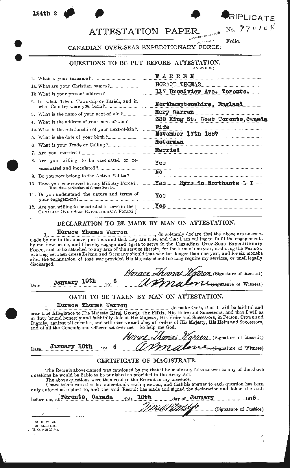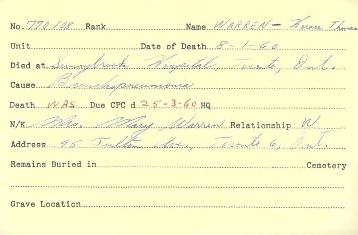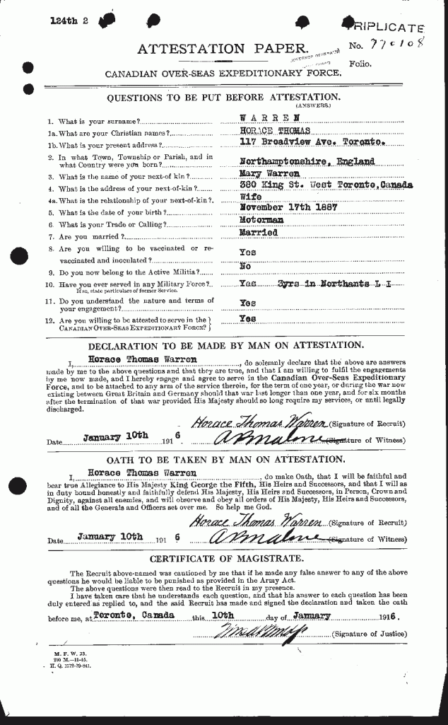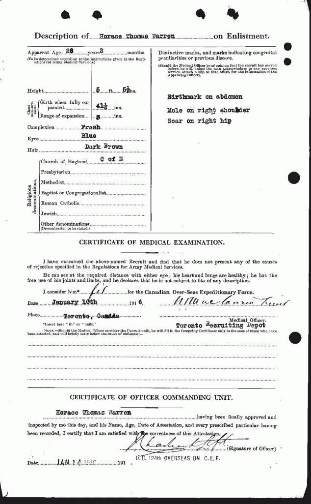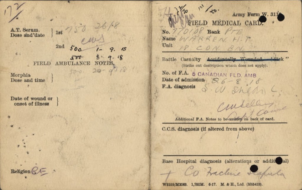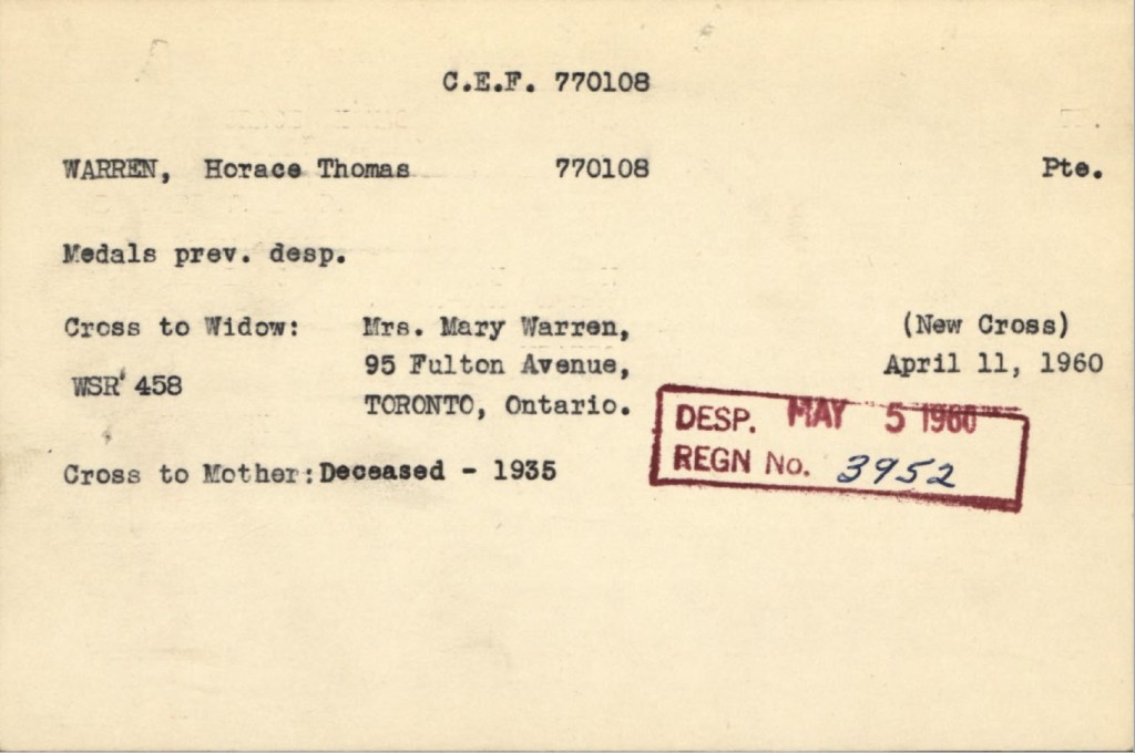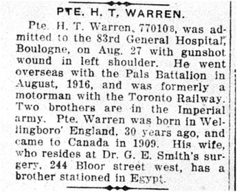 Warren, Horace Thomas: Service no. 770108 Digitized Service Record Source: Per news clipping post by David Archer at 18th Battalion Facebook Page (not group). Find-A-Grave Source: Toronto Telegram. September 1918. Per news clipping post by David Archer at 18th Battalion Facebook Page (not group). Share this: Click to email a link to a friend (Opens in new window) Email Click to share on Facebook (Opens in new window) Facebook Click to share on X (Opens in new window) X Click to share on Reddit (Opens in new window) Reddit Click to share on LinkedIn (Opens in new window) LinkedIn Click to print (Opens in new window) Print Click to share on Tumblr (Opens in new window) Tumblr Click to share on Pocket (Opens in new window) Pocket Click to share on Pinterest (Opens in new window) Pinterest Click to share on Telegram (Opens in new window) Telegram Click to share on WhatsApp (Opens in new window) WhatsApp Like Loading...