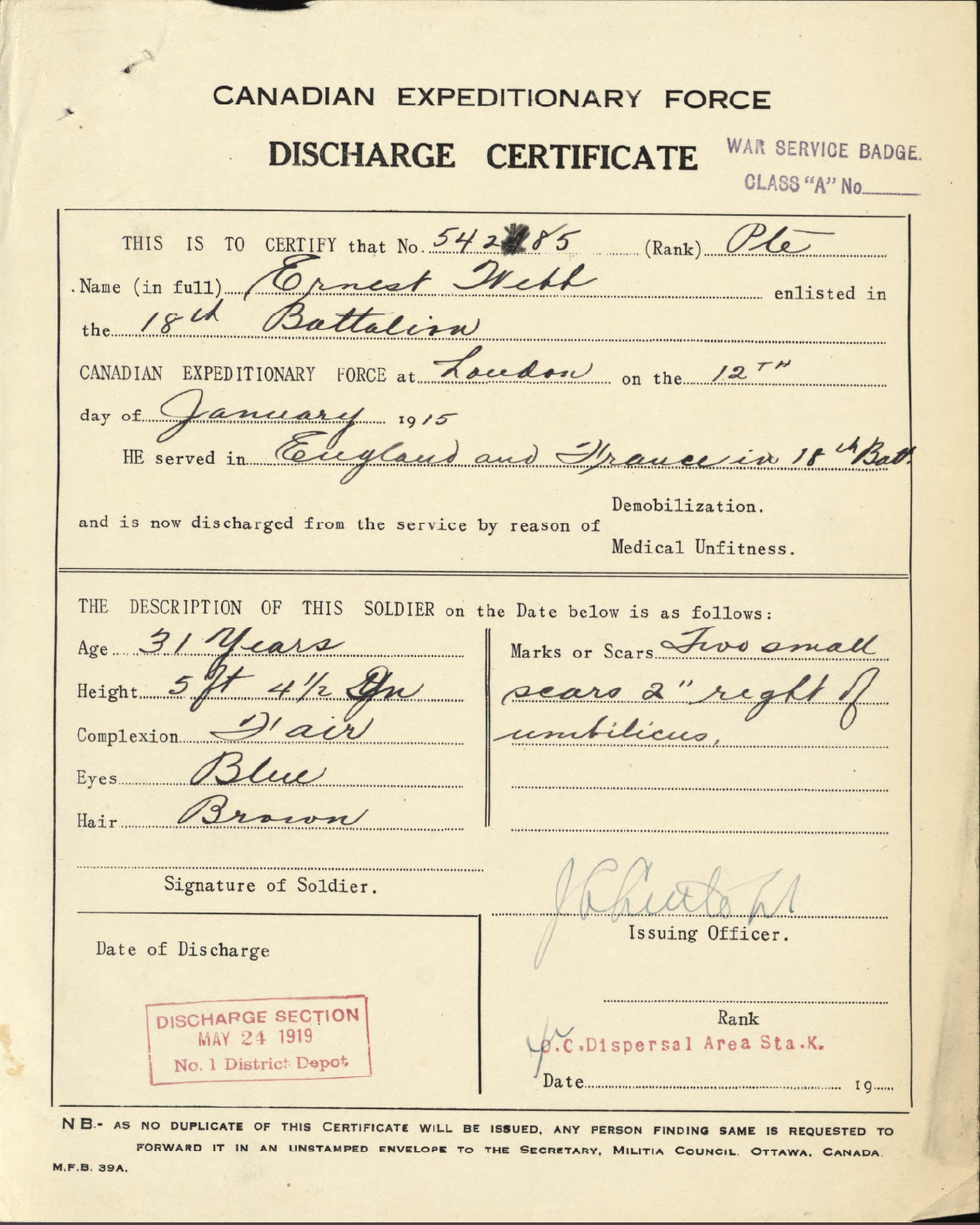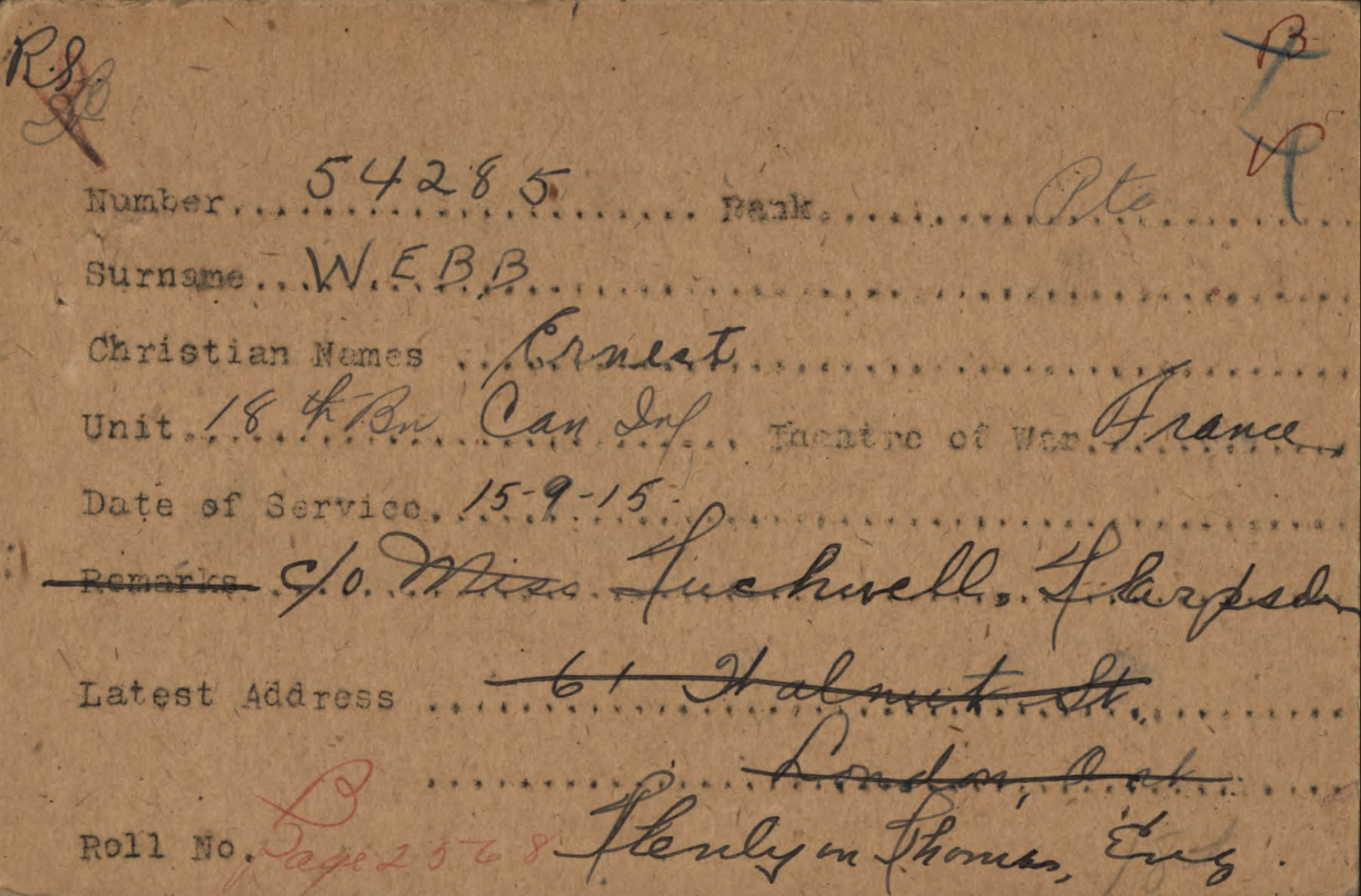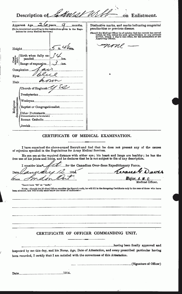 Family Search: When Private Ernest Webb was born on 3 April 1888, in Henley-on-Thames, Oxfordshire, England, United Kingdom, his father, William Webb, was 35 and his mother, Ellen, was 33. He immigrated to Canada in 1913 and lived in Harpsden, Oxfordshire, England, United Kingdom in 1911 and London, Ontario, Canada in 1919. He registered for military service in 1915. In 1914, at the age of 26, his occupation is listed as groom in London, Ontario, Canada.