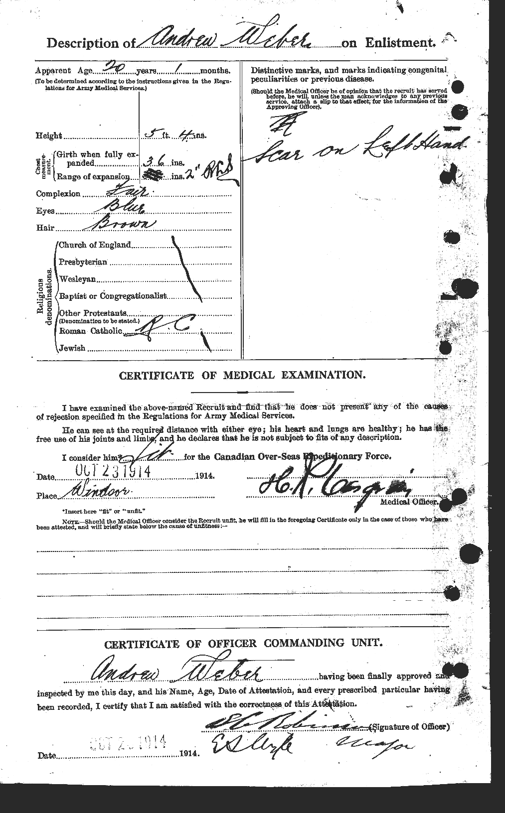 3205605 [conscripted regimental number] Second attestation to 1st Depot Battalion, Alberta Regiment on January 7, 1918 at Calgary, Alberta. Does not appear to be a conscription. Prior military shown as 18th Battalion with discharge because of “severe F.P.”? Birthdate is now September 12, 1897 as he would have been underage in the 1914 enlistment. Birthplace is now Clover Bar, Alberta instead of Luxemburg (sic) – must be wrong. Attestation says “Recruit First Depot Battalion – Examination for reclassification”