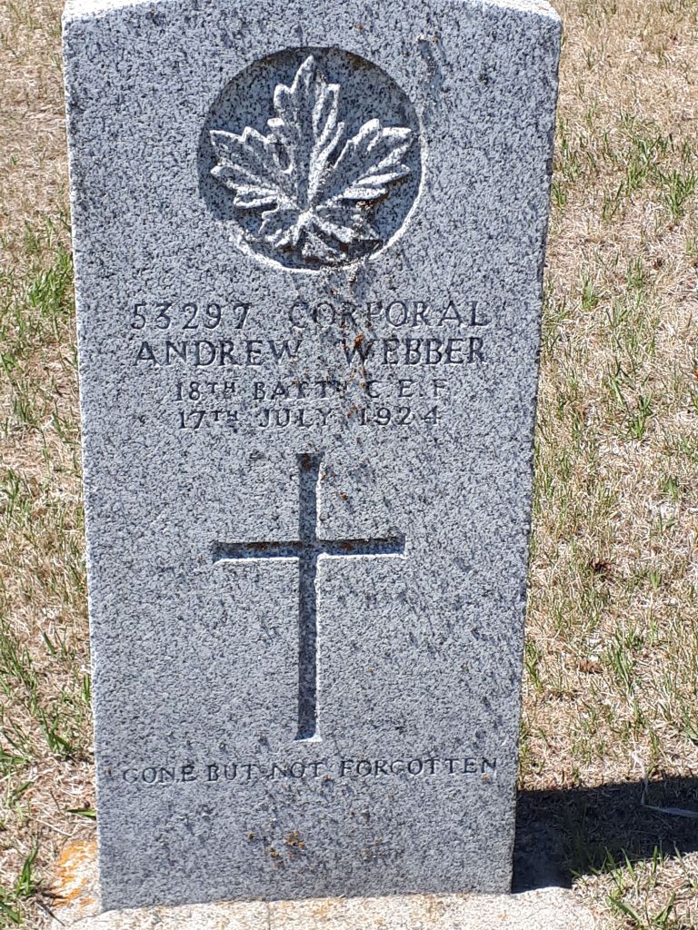 Family Search: Corporal Andrew Archibald Webber was born on 12 September 1897, in Eschdorf, Heiderscheid, Wiltz, Luxembourg as the son of John Henry Webber and Margaret. He married Daisy Pearl Stanley in 1919. They were the parents of at least 2 sons and 1 daughter. He immigrated to Canada in 190 and lived in Clover Bar No. 517, Alberta, Canada in 1918. He registered for military service in 1914. He died on 17 July 1924, in Winnipeg, Manitoba, Canada, at the age of 26, and was buried in Riverside Cemetery, La Rivière, Pembina, Manitoba