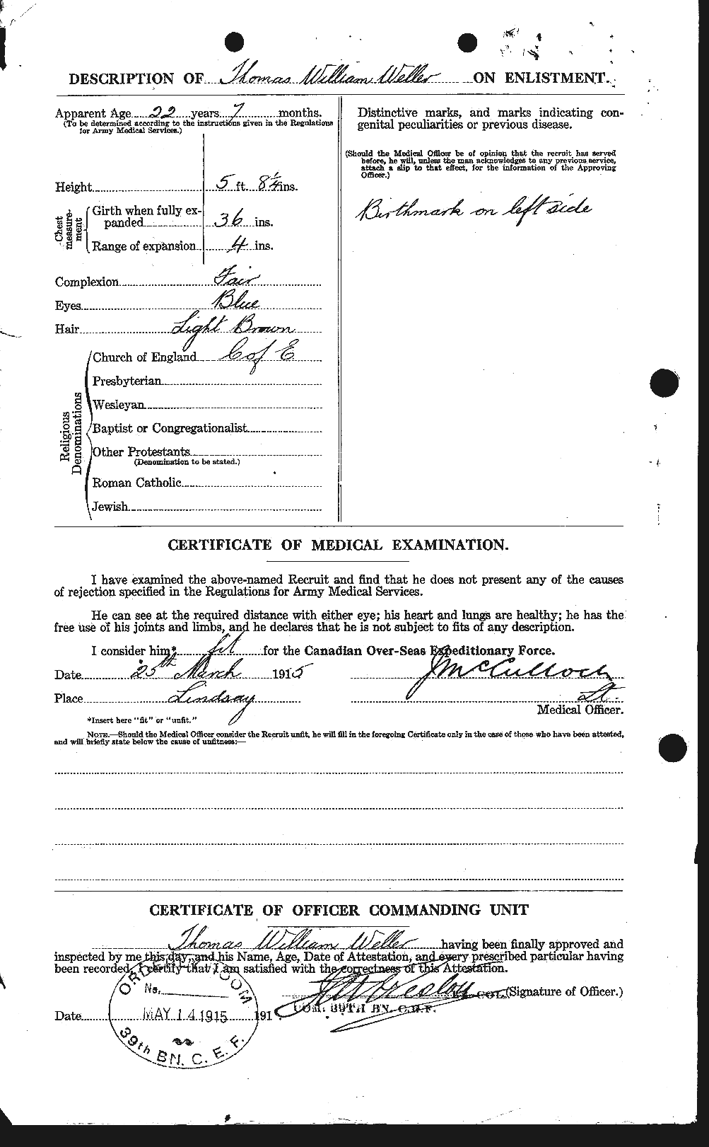 Family Search: When Private Thomas William Weller was born on 18 October 1892, in Sittingbourne, Kent, England, United Kingdom, his father, Edward William Weller, was 27 and his mother, Elizabeth Rose, was 28. He had at least 2 sons with Emily Alice Wright. He immigrated to Canada in 1913 and lived in Brantford, Brant, Ontario, Canada in 1922. He registered for military service in 1915. In 1915, at the age of 23, his occupation is listed as brickmaker. He died on 27 December 1960, in Brantford, Ontario, Canada, at the age of 68, and was buried in Mount Hope Cemetery, Brantford, Brant, Ontario, Canada.