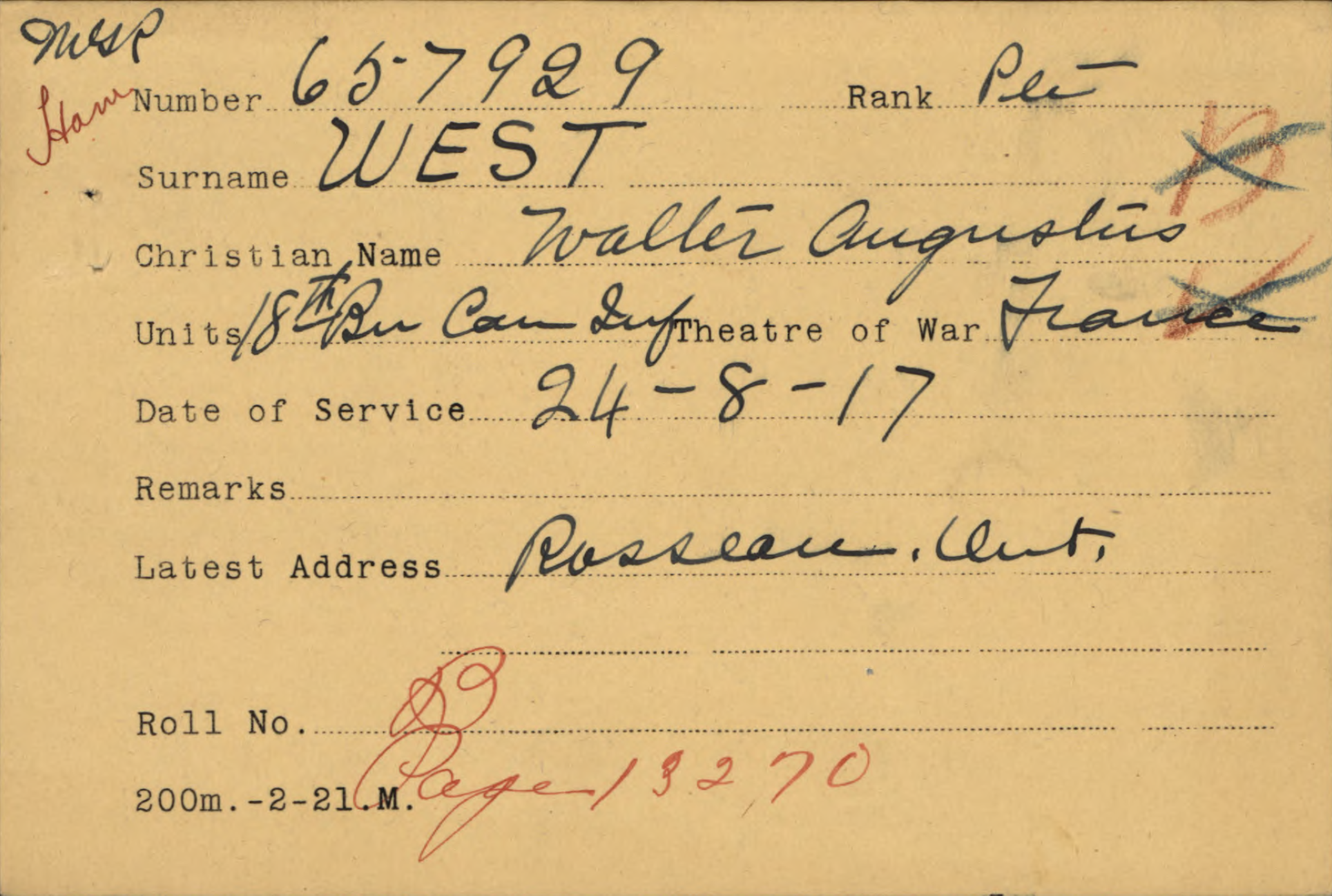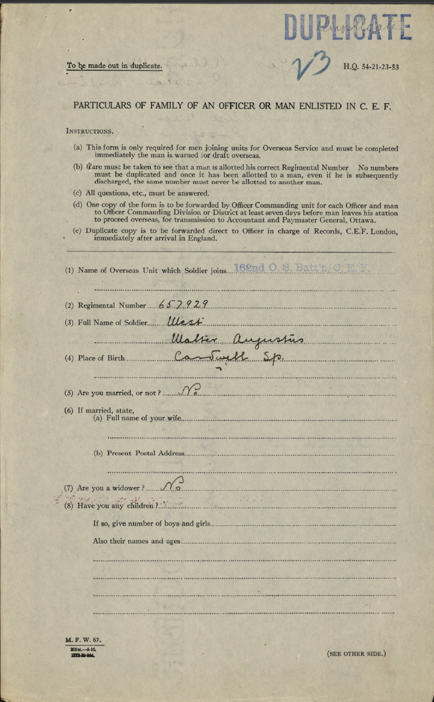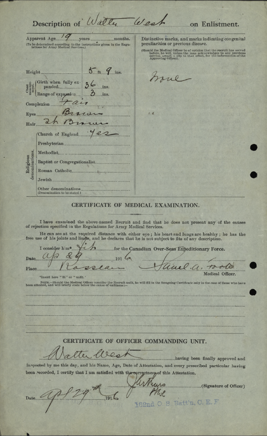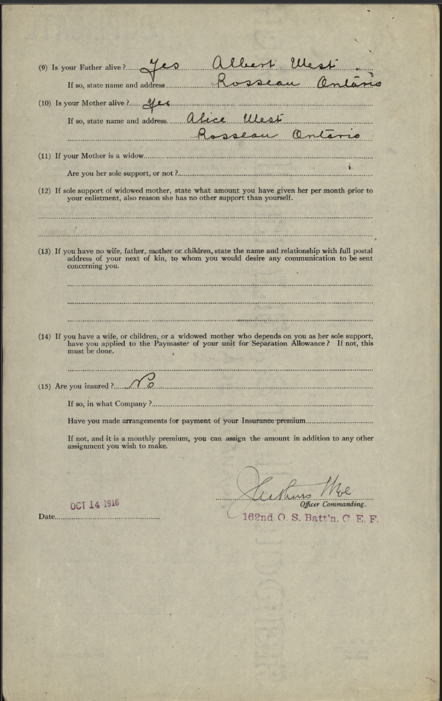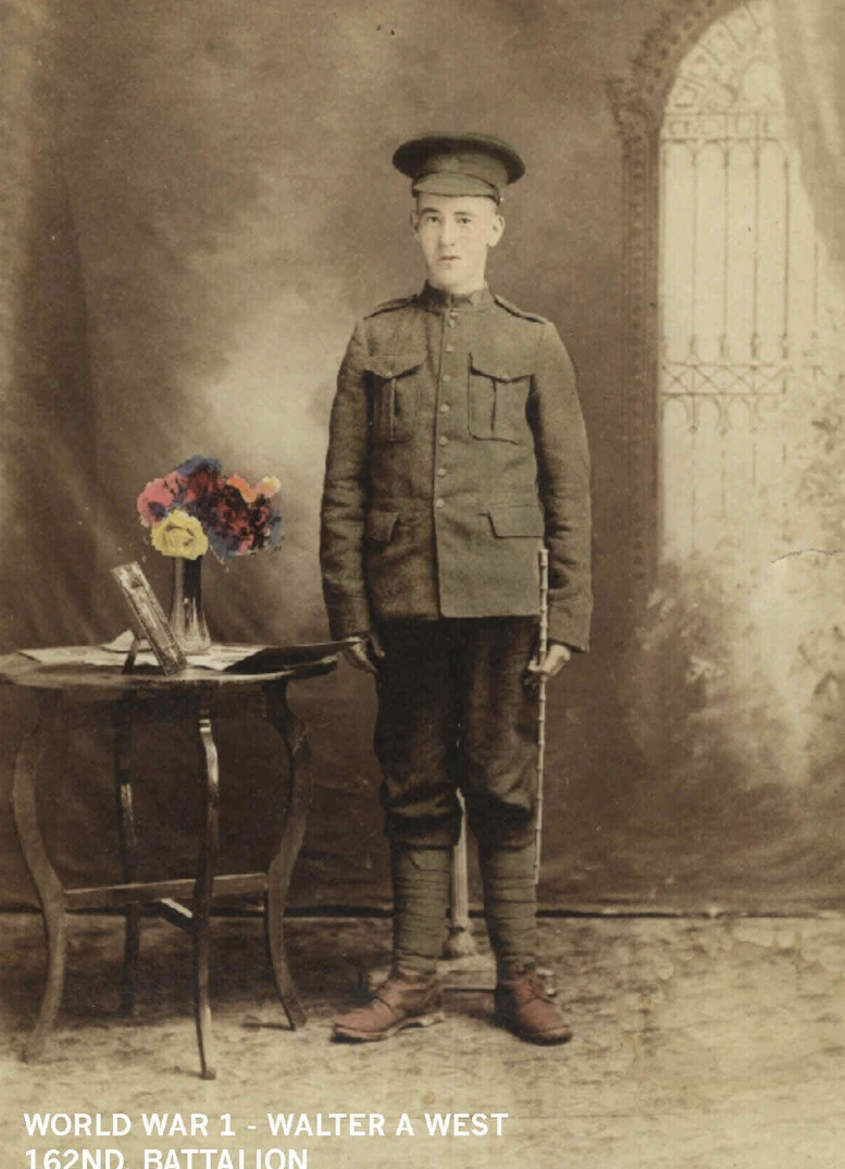 Family Search: When Private Walter Augustus West was born on 3 October 1898, in Northumberland, Ontario, Canada, his father, Albert Augustus West, was 26 and his mother, Alice Emily Hewitt, was 24. He married Mary Anne Jones on 5 September 1923, in Cardwell Township, Muskoka, Ontario, Canada. They were the parents of at least 4 sons and 1 daughter. He lived in Rosseau, Seguin Township, Parry Sound, Ontario, Canada in 1922 and Cardwell Township, Muskoka, Ontario, Canada in 1931. He registered for military service in 1916. In 1931, at the age of 33, his occupation is listed as farmer in Cardwell Township, Muskoka, Ontario, Canada. He died on 29 October 1969, in Huntsville, Muskoka, Ontario, Canada, at the age of 71, and was buried in Hutcheson Memorial Cemetery, Huntsville, Muskoka, Ontario, Canada.