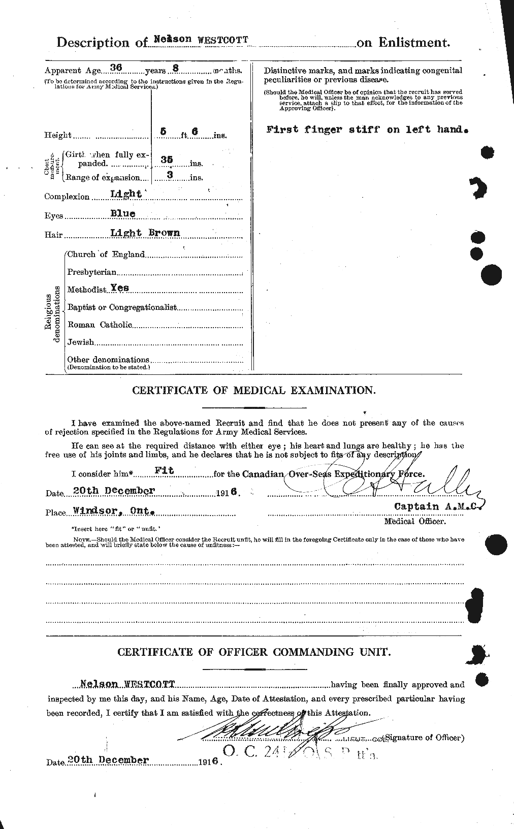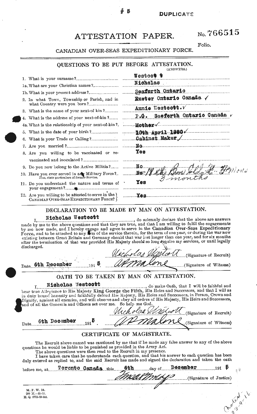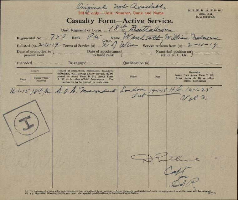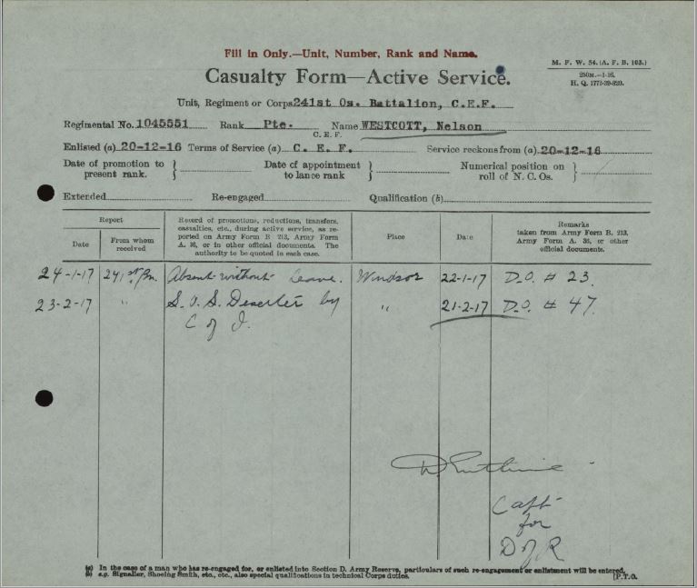 Initially appears to have enlisted with the 18th Battalion and served with this battalion for 3 months. He was Stuck Off Strength on January 15, 1915 for misconduct. Attempted enlistment in Toronto under reg. no. 766515 on December 6, 1915 and then with the 241st OS Battalion in Windsor, Ontario on December 20, 1916. He deserted.