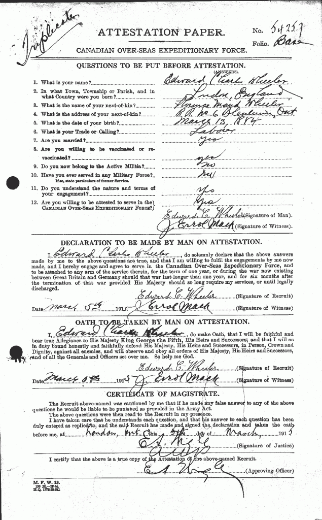 Family Search: When Edward Charles Wheeler was born on 13 March 1885, in Canning Town, Essex, England, United Kingdom, his father, Edward John Wheeler, was 41 and his mother, Jane Lea, was 21. He married Florence Maud Gilling on 27 February 1908, in Grays, Essex, England, United Kingdom. They were the parents of at least 2 sons and 1 daughter. He immigrated to Canada in 1913 and lived in Blenheim, Chatham-Kent, Ontario, Canada in 1914. He registered for military service in 1915. In 1914, at the age of 29, his occupation is listed as labourer in Blenheim, Chatham-Kent, Ontario, Canada. He died on 10 October 1968, in Windsor, Essex, Ontario, Canada, at the age of 83.