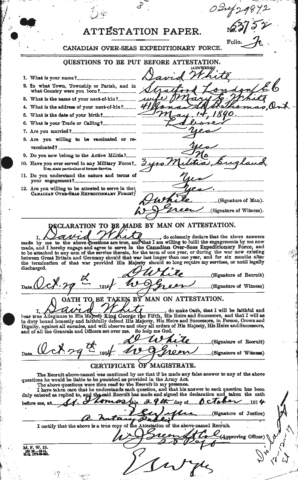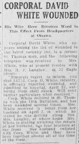 White, David Thomas: Service no. 53752 Digitized Service Record Source: War Diary. Find-A-Grave St. Thomas Times. 24 April 1916. Via Allan Miller 18th Battalion Facebook Group. Share this: Click to email a link to a friend (Opens in new window) Email Click to share on Facebook (Opens in new window) Facebook Click to share on X (Opens in new window) X Click to share on Reddit (Opens in new window) Reddit Click to share on LinkedIn (Opens in new window) LinkedIn Click to print (Opens in new window) Print Click to share on Tumblr (Opens in new window) Tumblr Click to share on Pocket (Opens in new window) Pocket Click to share on Pinterest (Opens in new window) Pinterest Click to share on Telegram (Opens in new window) Telegram Click to share on WhatsApp (Opens in new window) WhatsApp Like Loading... 2 thoughts on “White, David Thomas: Service no. 53752” Add yours RSM of the 18th was William Joseph White. Reply Doug, Thank you very much for this information. Eric Reply Leave a comment Cancel reply Δ This site uses Akismet to reduce spam. Learn how your comment data is processed.