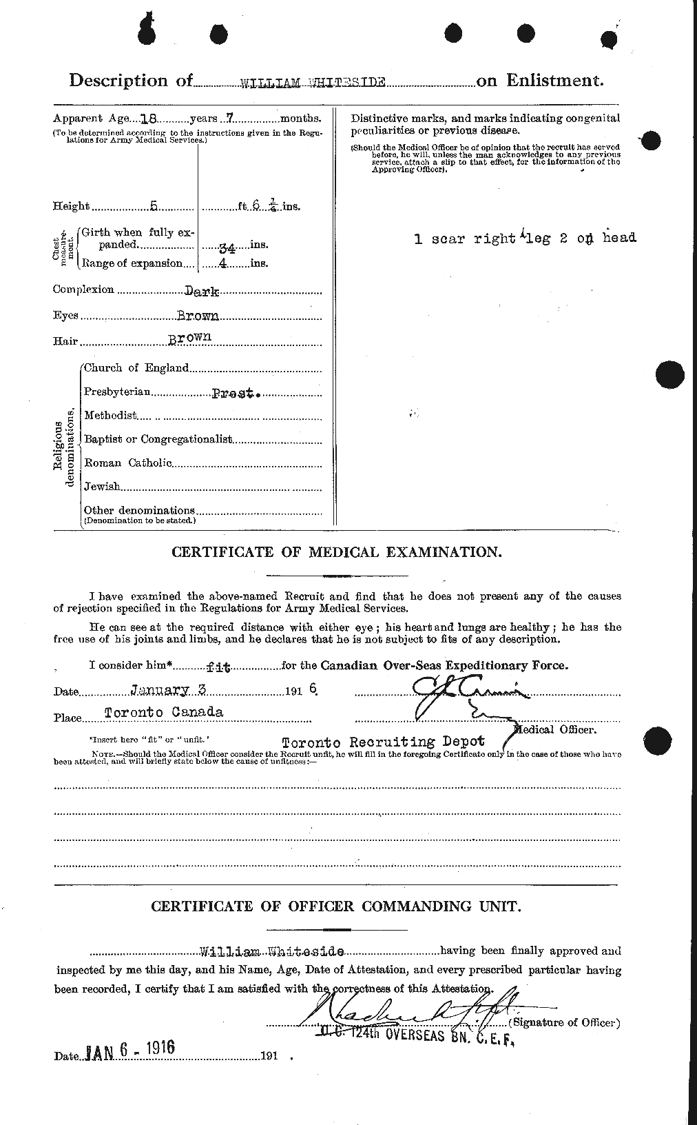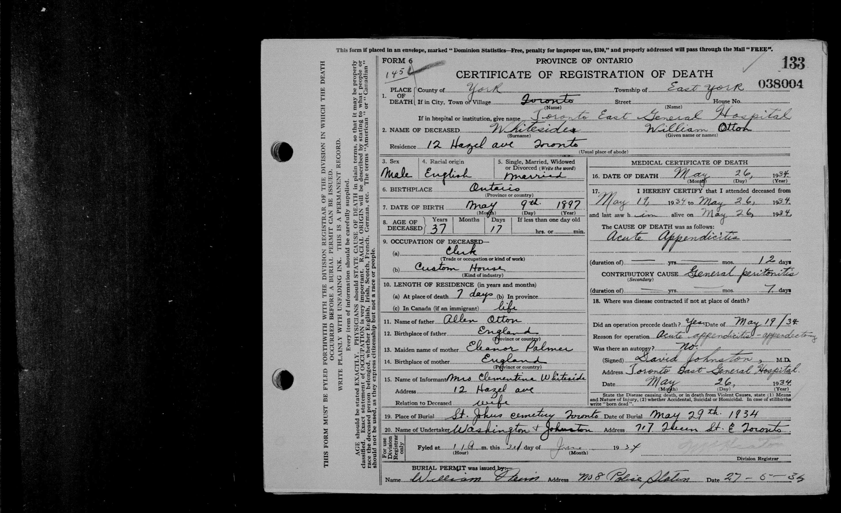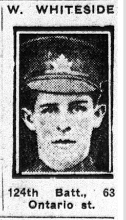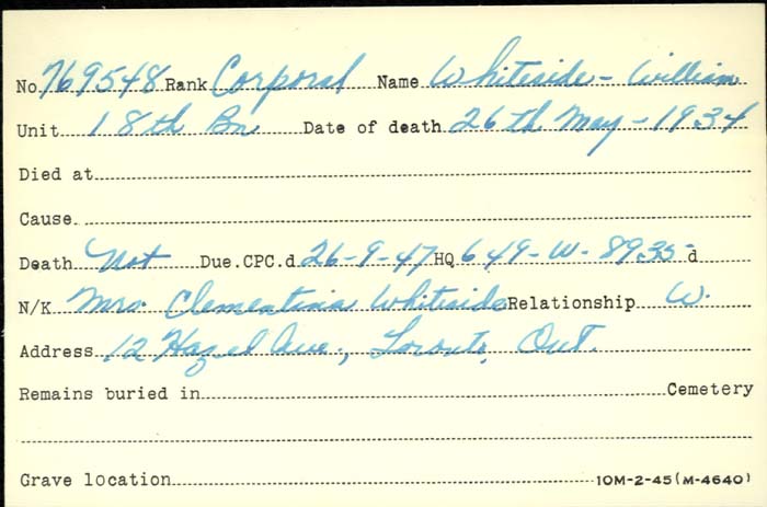 Family Search: Private William Otton Whiteside was born on 9 May 1897, in Bradford, West Gwillimbury, Simcoe, Ontario, Canada as the son of Allen Otton Whiteside and Eleanor Palmer. He had at least 2 sons and 1 daughter with Clementina Mary Harte Champion. He lived in Toronto, Ontario, Canada in 1916 and Toronto, York, Ontario, Canada in 1934. He registered for military service in 1916. In 1934, at the age of 37, his occupation is listed as clerk, custom house in Toronto, York, Ontario, Canada. He died on 26 May 1934, in East York, Toronto, Ontario, Canada, at the age of 37, and was buried in St John’s Norway Cemetery, Toronto, Ontario, Canada