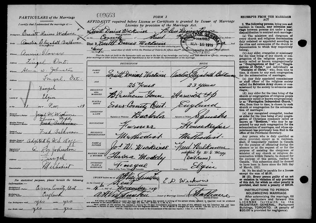 Family Search: When Private Everett Darius Wickwire was born on 5 February 1894, in Wheatley, Kent, Ontario, Canada, his father, Joseph Wesley Wickwire, was 28 and his mother, Theresa Adela Moody, was 21. He married Amelia Elizabeth Balkman on 4 November 1919, in Chatham, Kent, Ontario, Canada. They were the parents of at least 1 daughter. He lived in Kent, Ontario, Canada in 1911 and Blenheim, Kent, Ontario, Canada for about 61 years. He registered for military service in 1916. In 1916, at the age of 22, his occupation is listed as farmer in Blenheim, Kent, Ontario, Canada. He died in April 1977, at the age of 83, and was buried in Evergreen Cemetery, Blenheim, Chatham-Kent, Ontario, Canada.