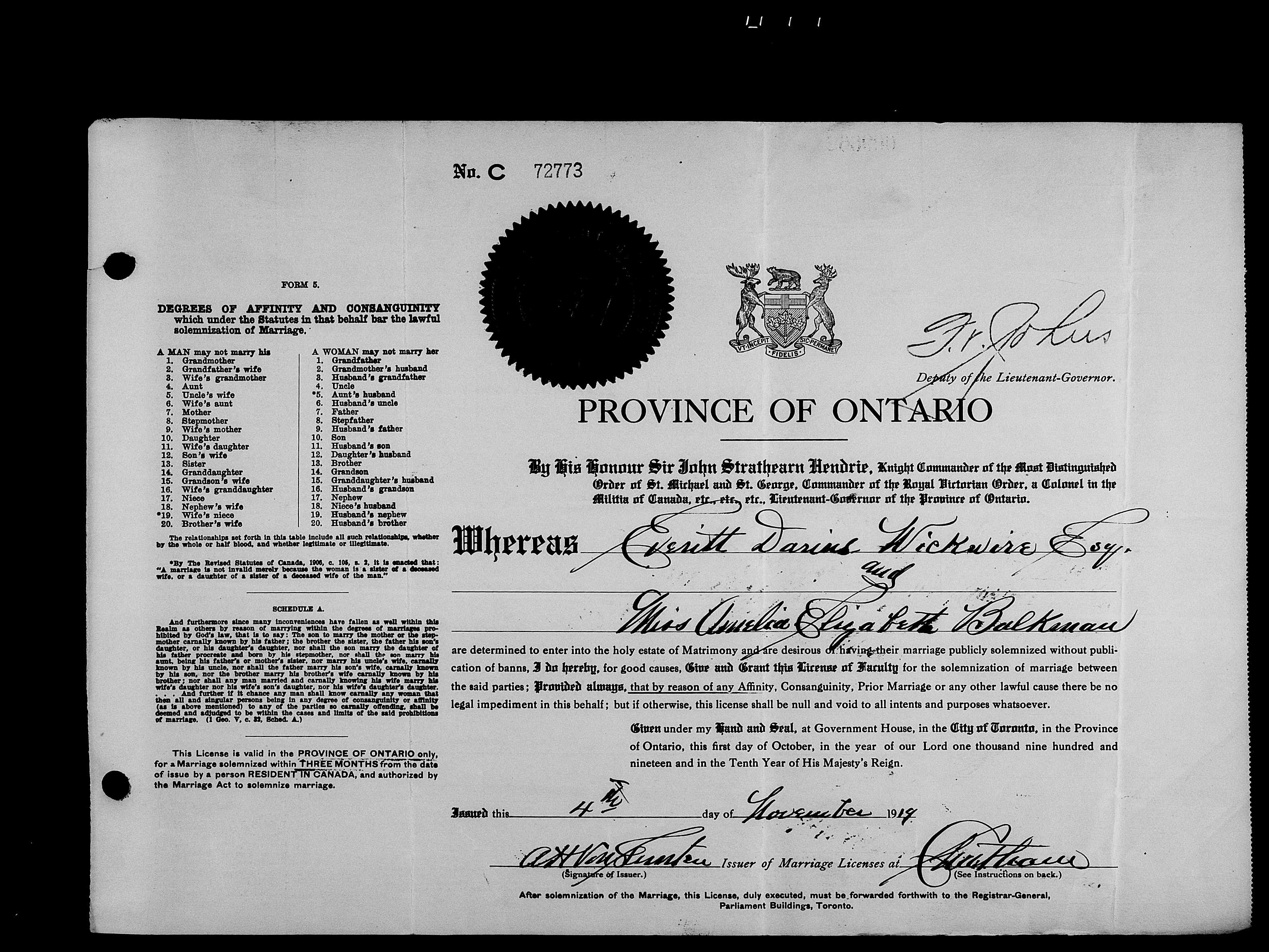 Family Search: When Private Everett Darius Wickwire was born on 5 February 1894, in Wheatley, Kent, Ontario, Canada, his father, Joseph Wesley Wickwire, was 28 and his mother, Theresa Adela Moody, was 21. He married Amelia Elizabeth Balkman on 4 November 1919, in Chatham, Kent, Ontario, Canada. They were the parents of at least 1 daughter. He lived in Kent, Ontario, Canada in 1911 and Blenheim, Kent, Ontario, Canada for about 61 years. He registered for military service in 1916. In 1916, at the age of 22, his occupation is listed as farmer in Blenheim, Kent, Ontario, Canada. He died in April 1977, at the age of 83, and was buried in Evergreen Cemetery, Blenheim, Chatham-Kent, Ontario, Canada.
