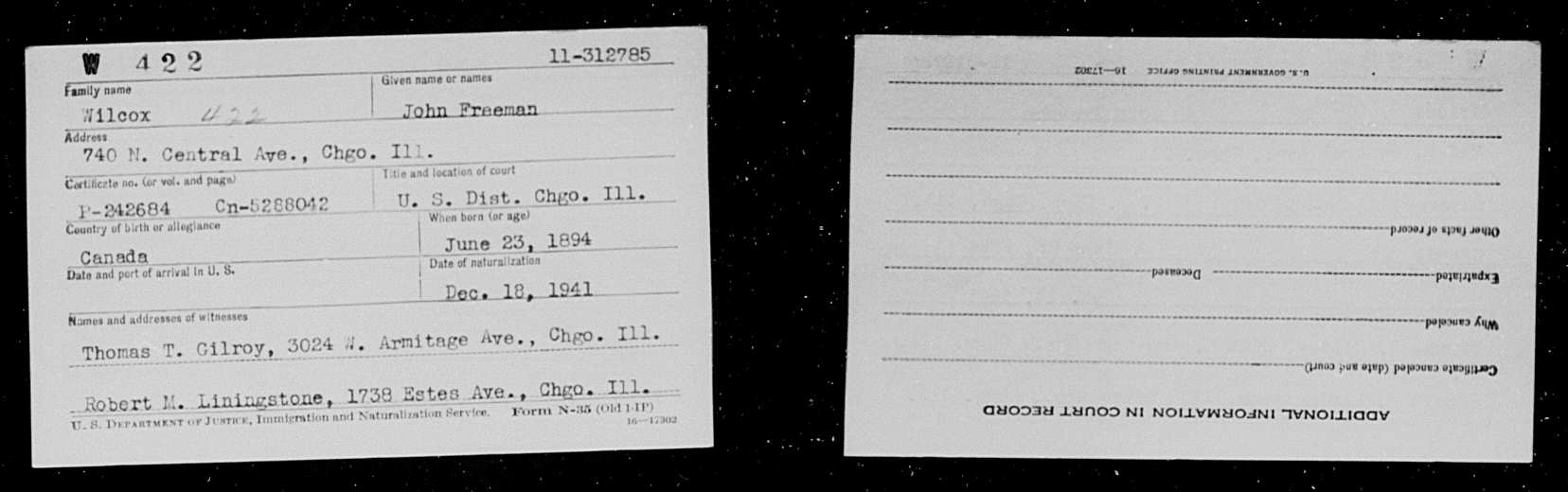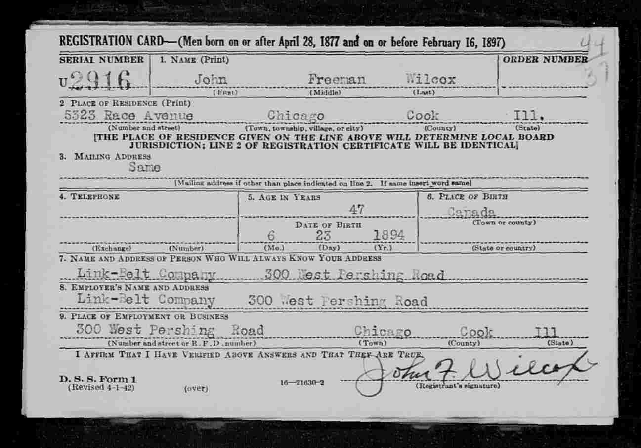 Family Search: When Private John Freeman Wilcox was born on 23 June 1894, in Port Credit, Mississauga, Peel, Ontario, Canada, his father, Henry Horatio Wilcox, was 40 and his mother, Elizabeth Roberts, was 33. He married Beatrice M Frankenstein on 8 December 1921, in Cook, Illinois, United States. They were the parents of at least 1 son. He immigrated to Chicago, Cook, Illinois, United States in 1941 and lived in Ontario, Canada in 1894 and Peel, Ontario, Canada in 1901. He died on 18 September 1968, in Chicago, Cook, Illinois, United States, at the age of 74, and was buried in Forest Home Cemetery, Forest Park, Cook, Illinois, United States.