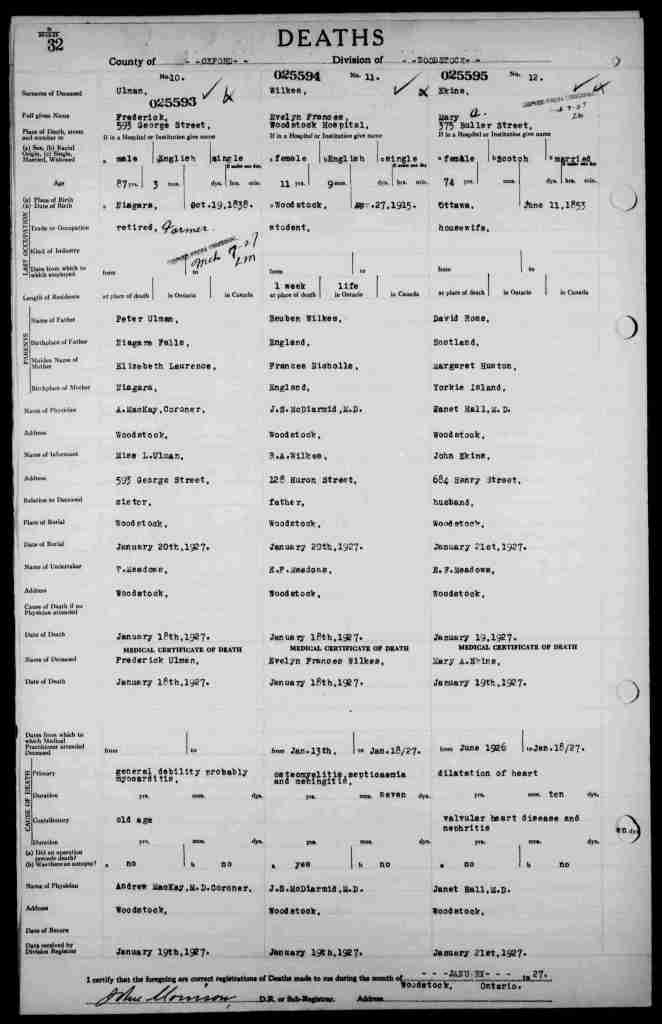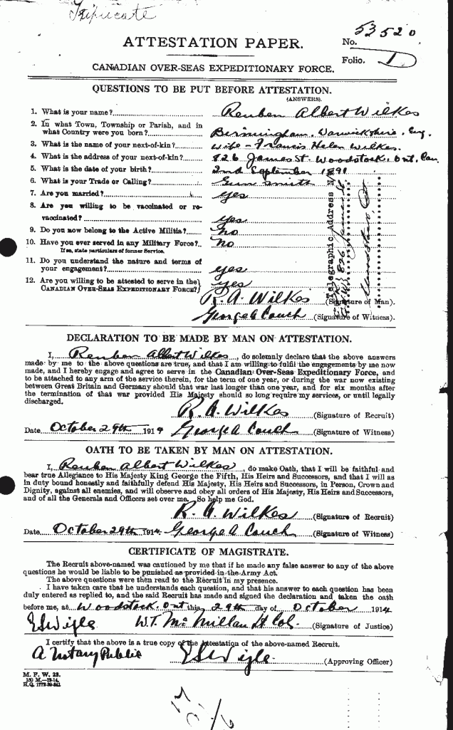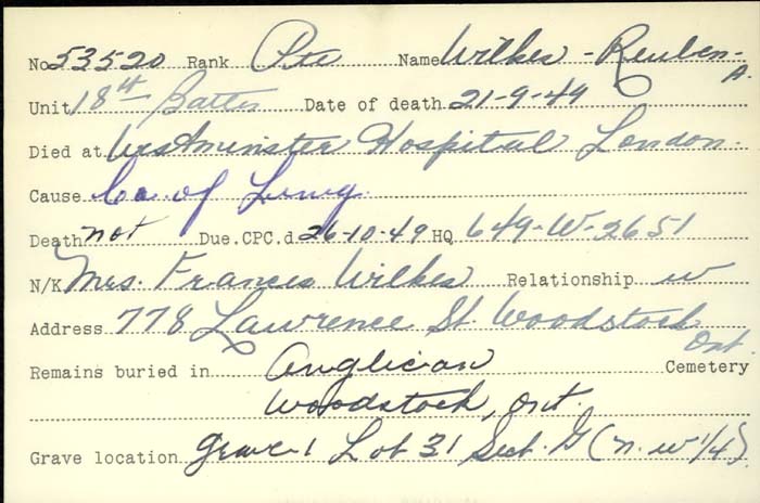 Family Search: Reuben Albert Wilkes was born on 2 September 1891, in Birmingham, Warwickshire, England, United Kingdom as the son of Reuben Wilkes and Kate Rooke. He married Frances Ellen Nicholls on 30 May 1911, in Woodstock, Oxford, Ontario, Canada. They were the parents of at least 1 son and 2 daughters. He lived in Oxford, Ontario, Canada in 1911 and Woodstock, Oxford, Ontario, Canada in 1921. He registered for military service in 1914. In 1919, at the age of 28, his occupation is listed as sign writer. He died on 21 September 1949, in London, Ontario, Canada, at the age of 58, and was buried in Anglican Cemetery, Woodstock, Oxford, Ontario, Canada.