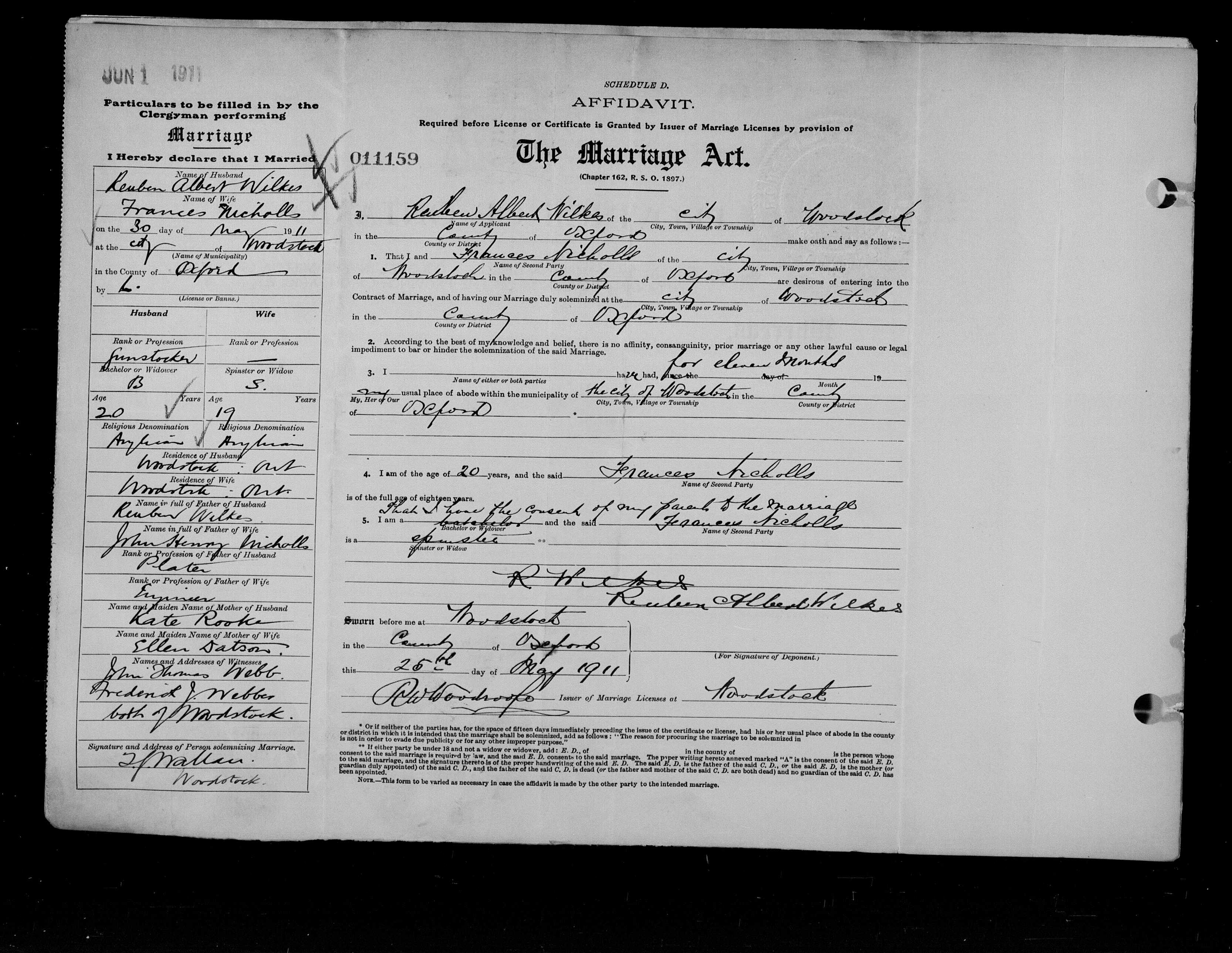 11159-11 Reuben Albert WILKES, 20, gunstocker?, of Woodstock, s/o Reuben WILKES, plasterer, & Kate ROOKS, married Frances NICHOLLS, 19, of Woodstock, d/o John Henry NICHOLLS, engineer, & Ellen DATSON, witn: John Thomas WEBB & Frederick H. WEBBER, both of Woodstock, 30 May 1911 at Woodstock.