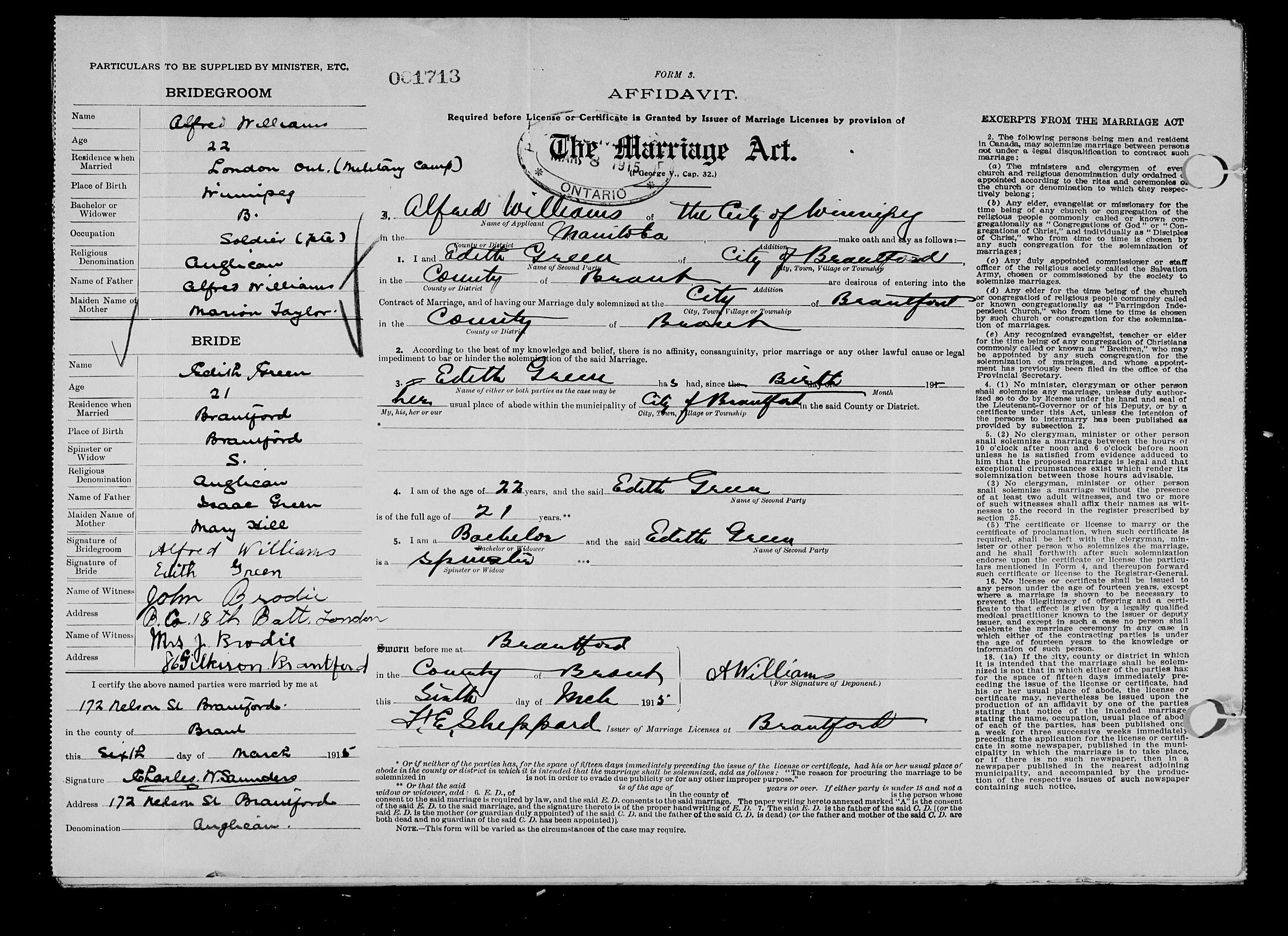 Private John Brodie was a witness to the marriage of this soldier to Edith Green.