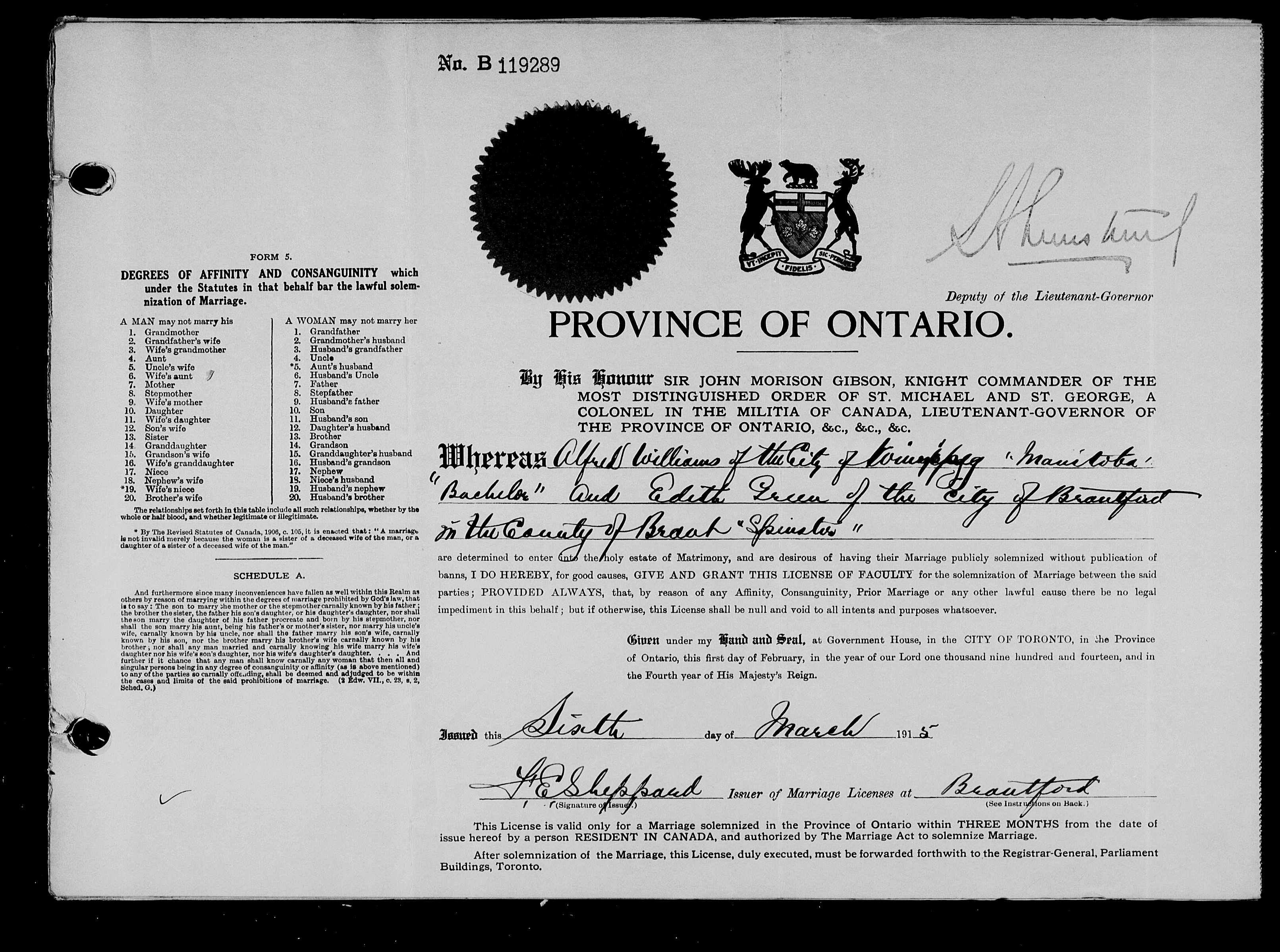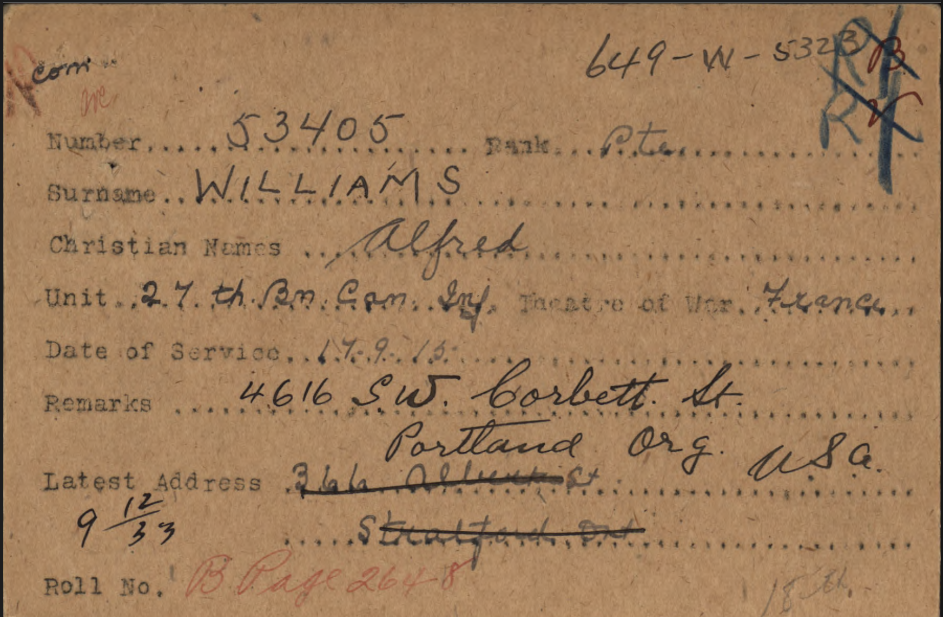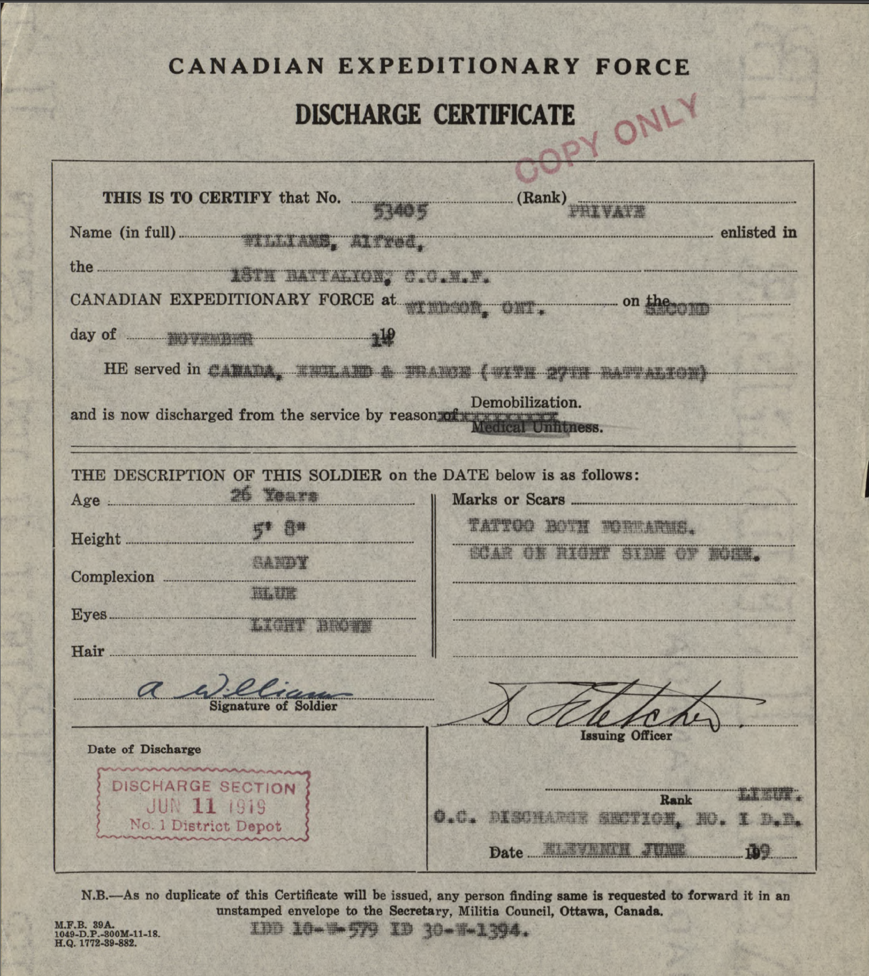 Family Search: Private Alfred Williams was born in 1893 as the son of Alfred Williams and Marion Taylor. He married Edith Green on 5 March 1915, in Brantford, Brant, Ontario, Canada. They were the parents of at least 1 daughter. He lived in Stratford, Perth, Ontario, Canada in 1921 and Portland, Multnomah, Oregon, United States in 1922. He registered for military service in 1914. In 1914, at the age of 21, his occupation is listed as labourer.