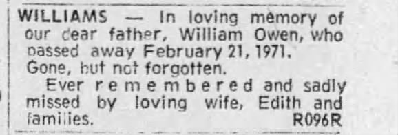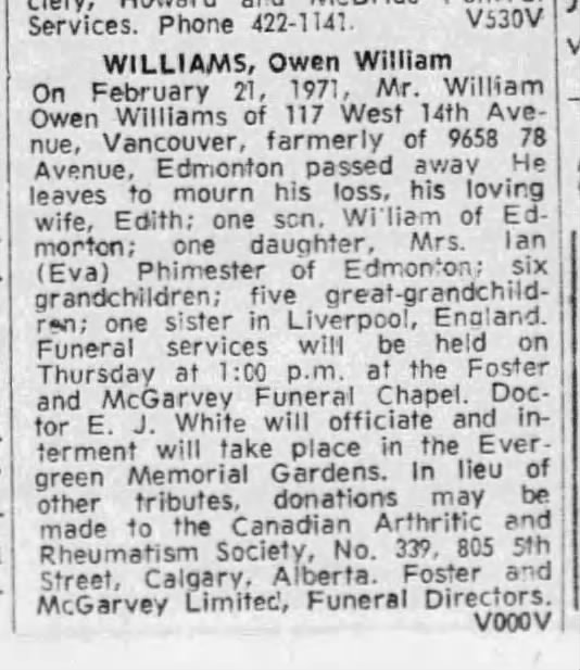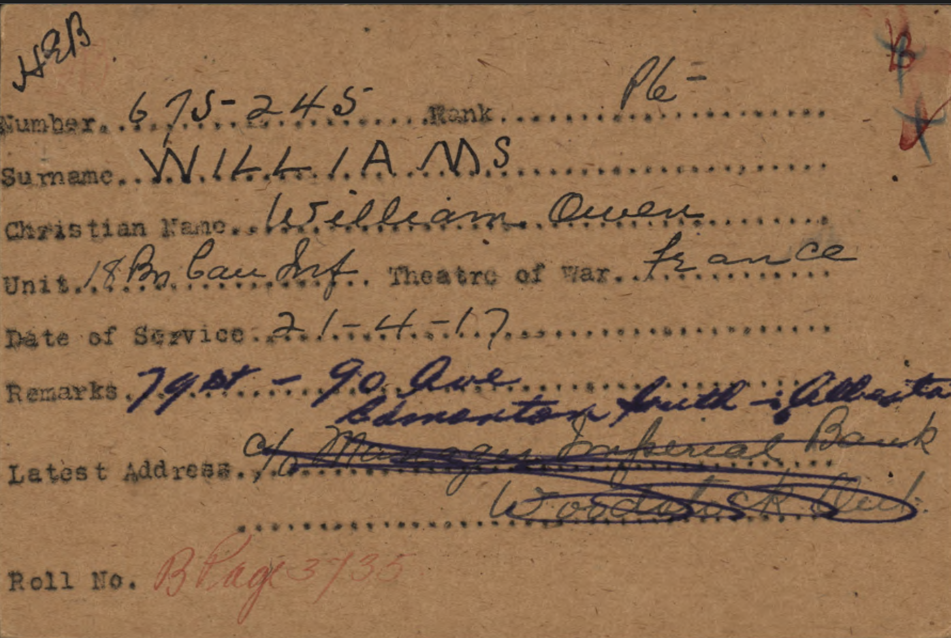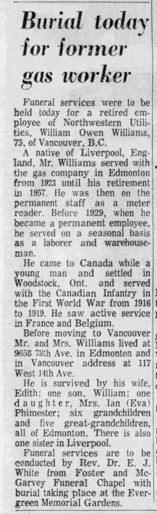 Family Search: Private William Owen Williams was born on 23 June 1895, in Liverpool, Lancashire, England, United Kingdom as the son of Mr William Williams and Margaret Jones. He married Edith Maude Williams in 1920. They were the parents of at least 1 son and 1 daughter. He immigrated to Canada in 1913 and lived in Embro, Oxford, Ontario, Canada in 1916 and Edmonton, Alberta, Canada in 1960. He registered for military service in 1916. In 1923, his occupation is listed as gas worker, northwestern utilities in Edmonton, Alberta, Canada. He died on 21 February 1971, in Vancouver, British Columbia, Canada, at the age of 75, and was buried in Evergreen Memorial Gardens, Edmonton, Alberta, Canada.