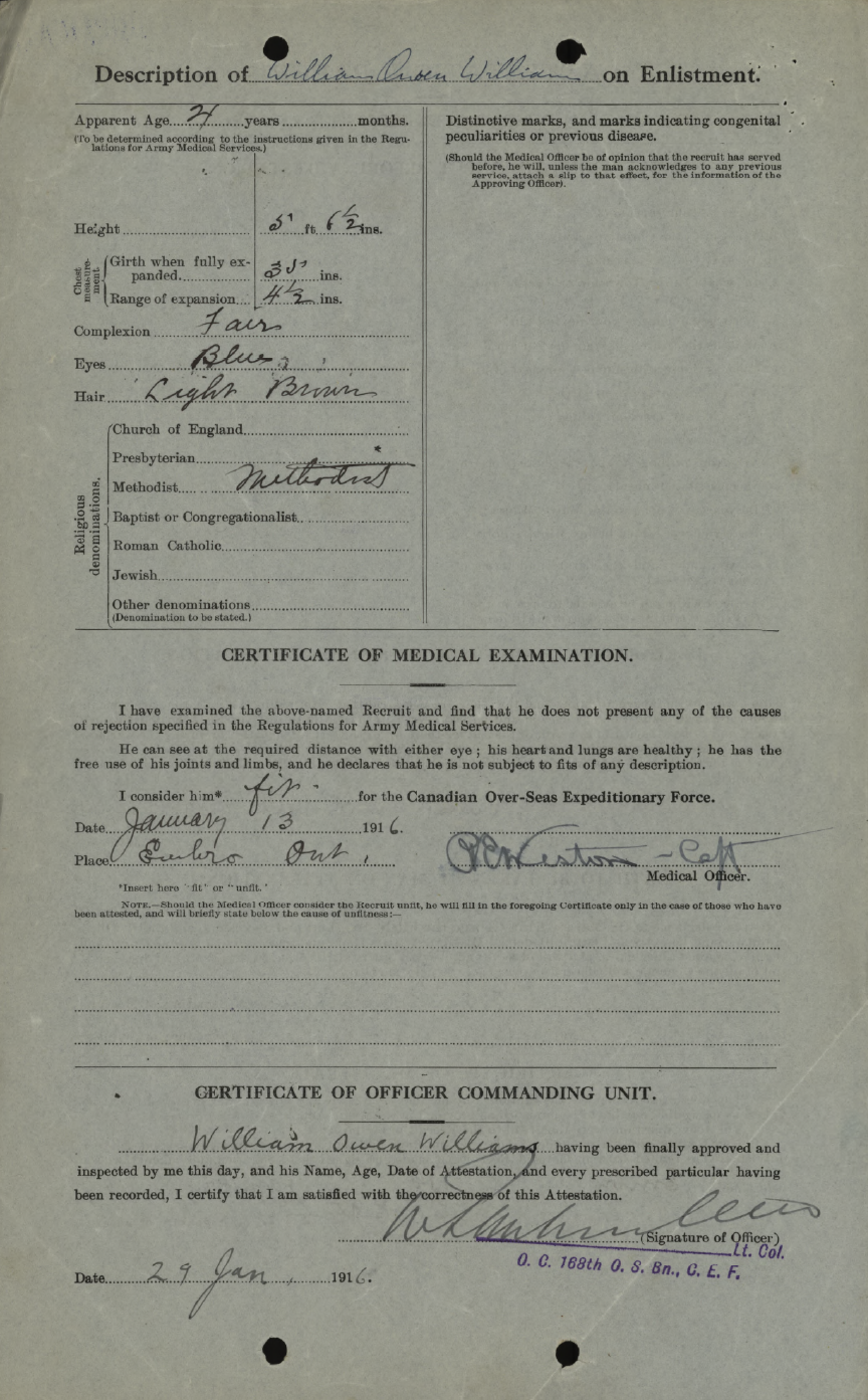 This man enlisted with the 168th Battalion on 13 January 1916, at Embro, Ontario. He was a farm labourer and listed his father, William, as his next of kin. His father is recorded as living at 11 Porvois Street, Liverpool, England.