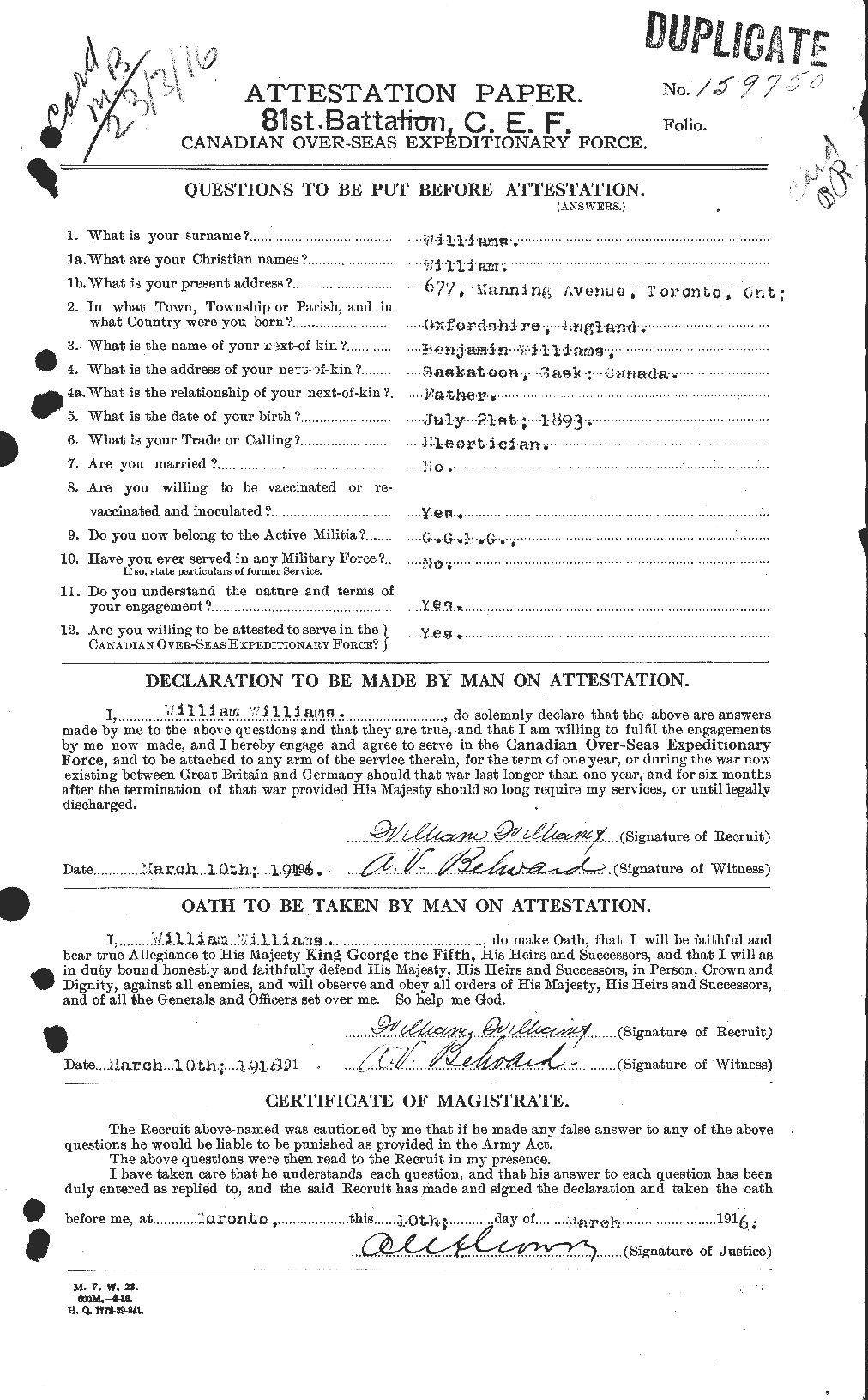 Source: Mentioned in Pte. Arthur Stone Bennett’s service record on Bennett’s promotion as Williams was invalided to England.
