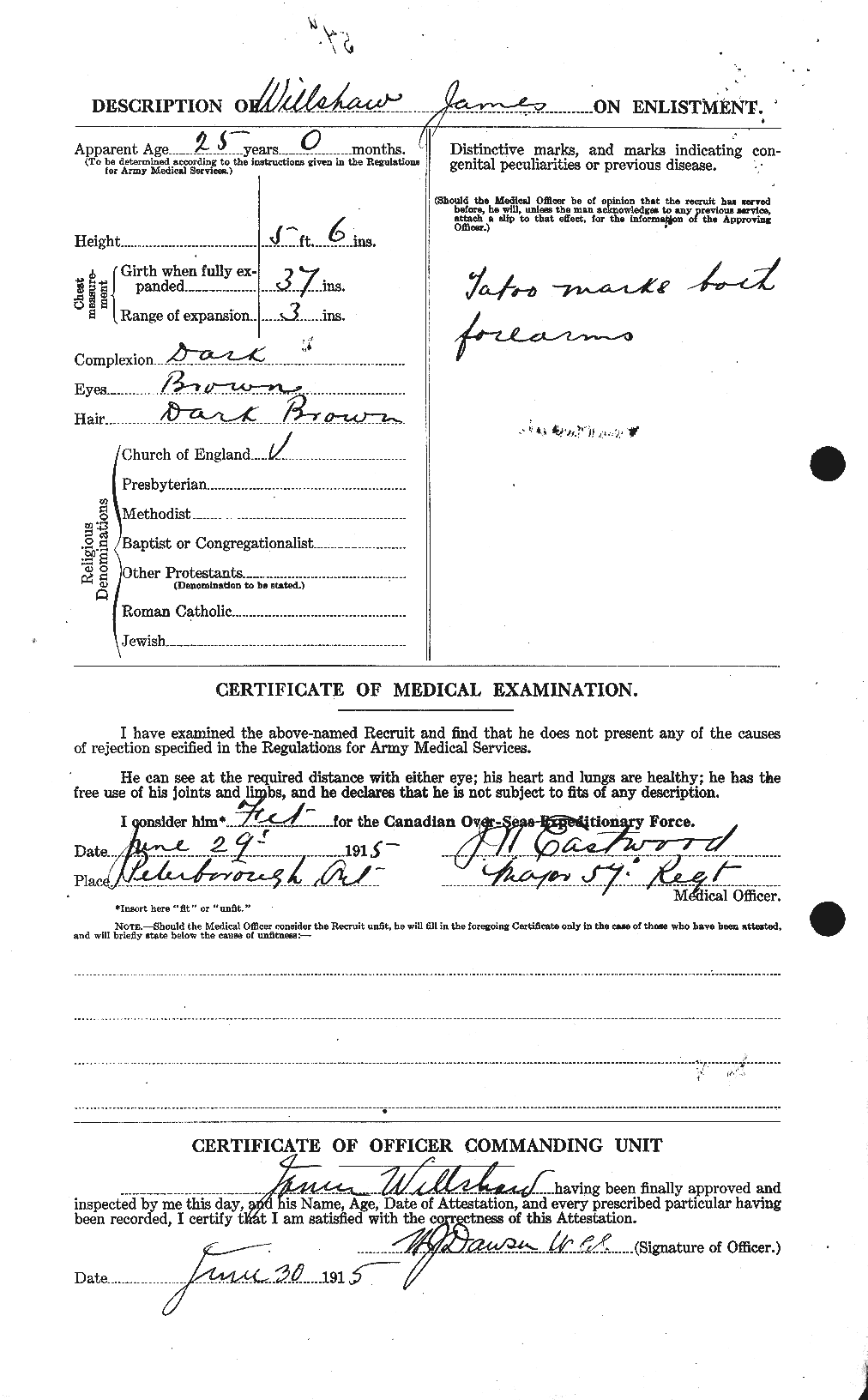 | July 4, 1915 | Enlists | Enlists with the 59th Battalion at Peterborough, Ontario. He is married to Rose Willshaw, and at 25-years of age is working as a spinner. He is 5’ 6” tall, a chest size of 37” with an expansion of 3”. He has a dark complexion, brown eyes, and dark brown hair. He has one year of experience with the 57th Regiment, “D” Company serving in the militia. |