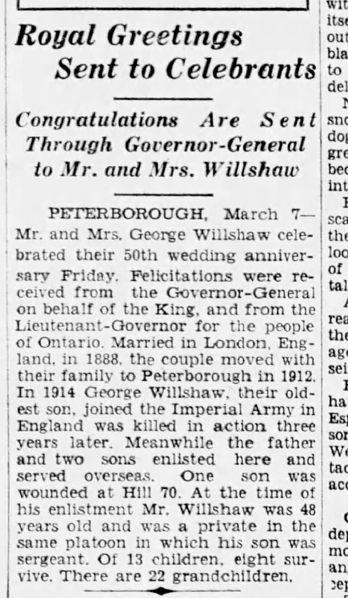 Family Search: When Private James Edward Willshaw was born on 11 July 1890, in Clapton, London, England, United Kingdom, his father, George Thomas Willshaw, was 23 and his mother, Louisa Jane Langley, was 22. He had at least 4 sons and 6 daughters with Rose Holloway. He immigrated to Canada in 1913 and lived in Hackney, Middlesex, England, United Kingdom in 1911 and Peterborough, Peterborough, Ontario, Canada for about 16 years. He registered for military service in 1915. In 1931, at the age of 41, his occupation is listed as shoveler in Peterborough, Peterborough, Ontario, Canada. He died on 16 April 1963, in Peterborough, Ontario, Canada, at the age of 72, and was buried in Little Lake Cemetery, Peterborough, Peterborough, Ontario, Canada.