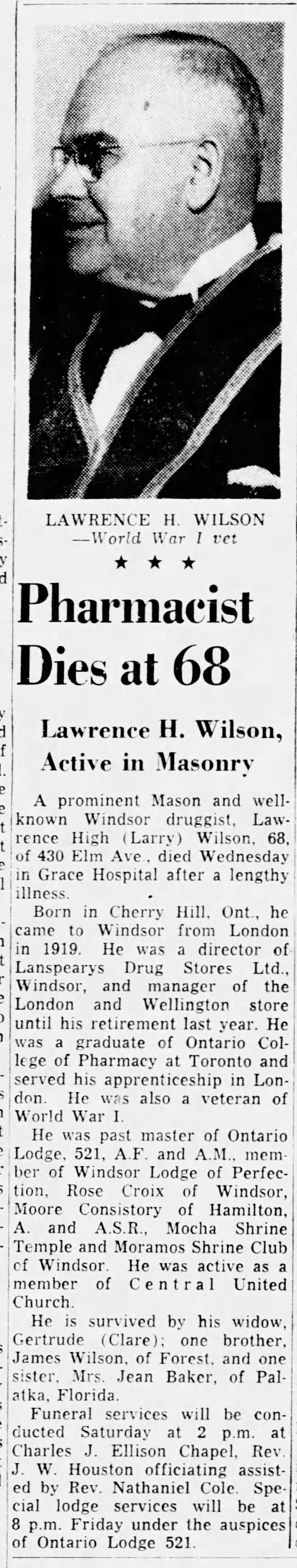A prominent Mason and well-known Windsor druggist, Lawrence Hugh (Larry) Wilson, 68, of 430 Elm Ave., died Wednesday at Grace Hospital after a lengthy illness.