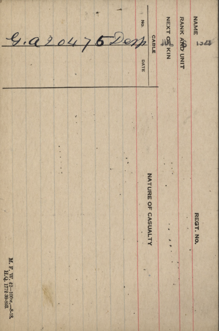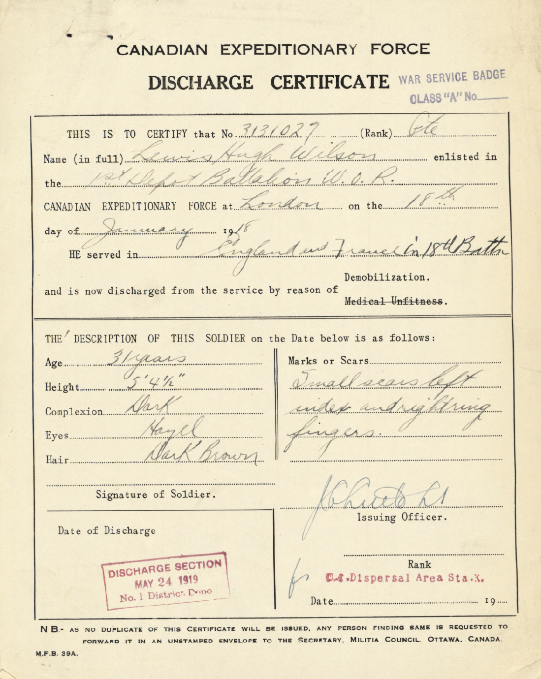 Family Search: When Private Lawrence Hugh Wilson was born on 14 August 1888, in Adelaide Township, Middlesex, Ontario, Canada, his father, Hugh Elliot Wilson, was 36 and his mother, Mary Jane Duffin, was 29. He lived in Middlesex, Ontario, Canada in 1901 and Windsor, Sandwich, Essex, Ontario, Canada in 1921. He registered for military service in 1918. In 1918, at the age of 30, his occupation is listed as druggist in London, Ontario, Canada. He died on 3 July 1957, in Windsor, Essex, Ontario, Canada, at the age of 68, and was buried in Oldcastle, Essex, Ontario, Canada.