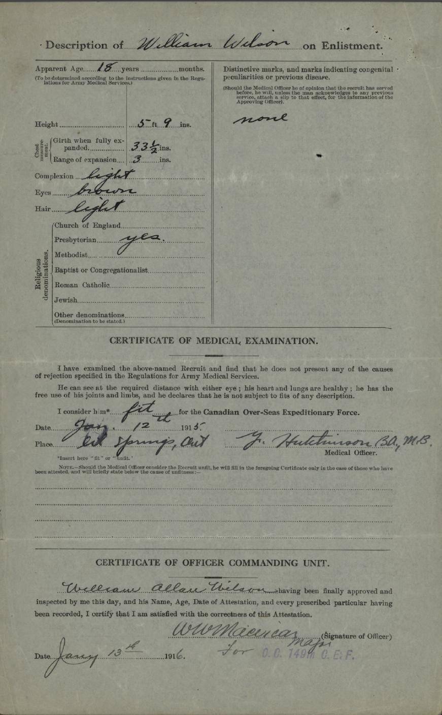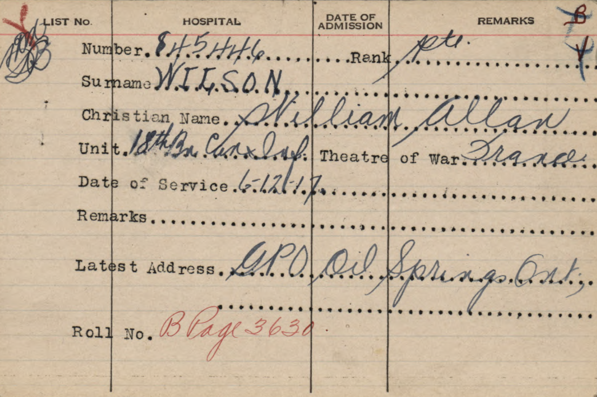 Family Search: When Private William Allan Wilson was born on 13 May 1898, in Oil Springs, Lambton, Canada West, British North America, his father, John Peter Wilson, was 42 and his mother, Dinah Jane Smyth, was 28. He lived in Lambton, Ontario, Canada for about 10 years and Oil Springs, Lambton, Ontario, Canada in 1916. He registered for military service in 1916. In 1943, his occupation is listed as letter carrier, Canada Post in Sarnia, Lambton, Ontario, Canada. He died on 10 October 1961, in St. Thomas, Elgin, Ontario, Canada, at the age of 63, and was buried in Oil Springs Cemetery, Oil Springs, Lambton, Ontario, Canada.