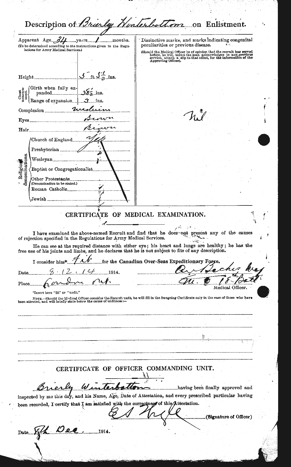 Family Search: When Brierley Winterbottom was born on 15 October 1880, in Derbyshire, England, United Kingdom, his father, William Winterbottom, was 28 and his mother, Anne, was 26. He immigrated to Halifax, Nova Scotia, Canada in 1910 and lived in Ripon, North Yorkshire, England, United Kingdom in 1921 and Gloucester, Gloucestershire, England, United Kingdom in 1939. He registered for military service in 1914. In 1914, at the age of 34, his occupation is listed as dental mechanic. He died in 1957, in Cheltenham, Gloucestershire, England, United Kingdom, at the age of 77.