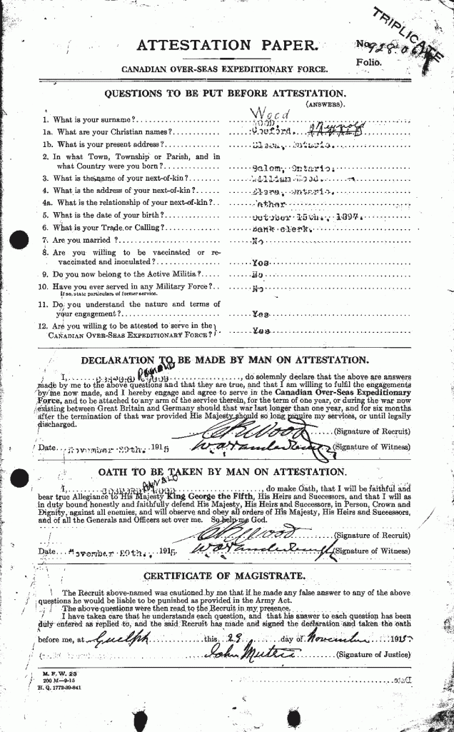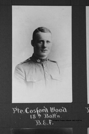 Family Search: When Private Cosford Reynolds Wood was born on 15 October 1898, in Salem, Wellington, Ontario, Canada, his father, William James Wood, was 45 and his mother, Elizabeth Cosford, was 42. He married Elizabeth Violet Vivette Mills on 21 August 1926, in Elora, Wellington, Ontario, Canada. They were the parents of at least 1 son. He lived in Wellington, Ontario, Canada for about 10 years. He registered for military service in 1915. In 1915, at the age of 17, his occupation is listed as bank clerk. He died on 28 February 1992, in Elora, Wellington, Ontario, Canada, at the age of 93, and was buried in Elora Cemetery, Elora, Wellington, Ontario, Canada.