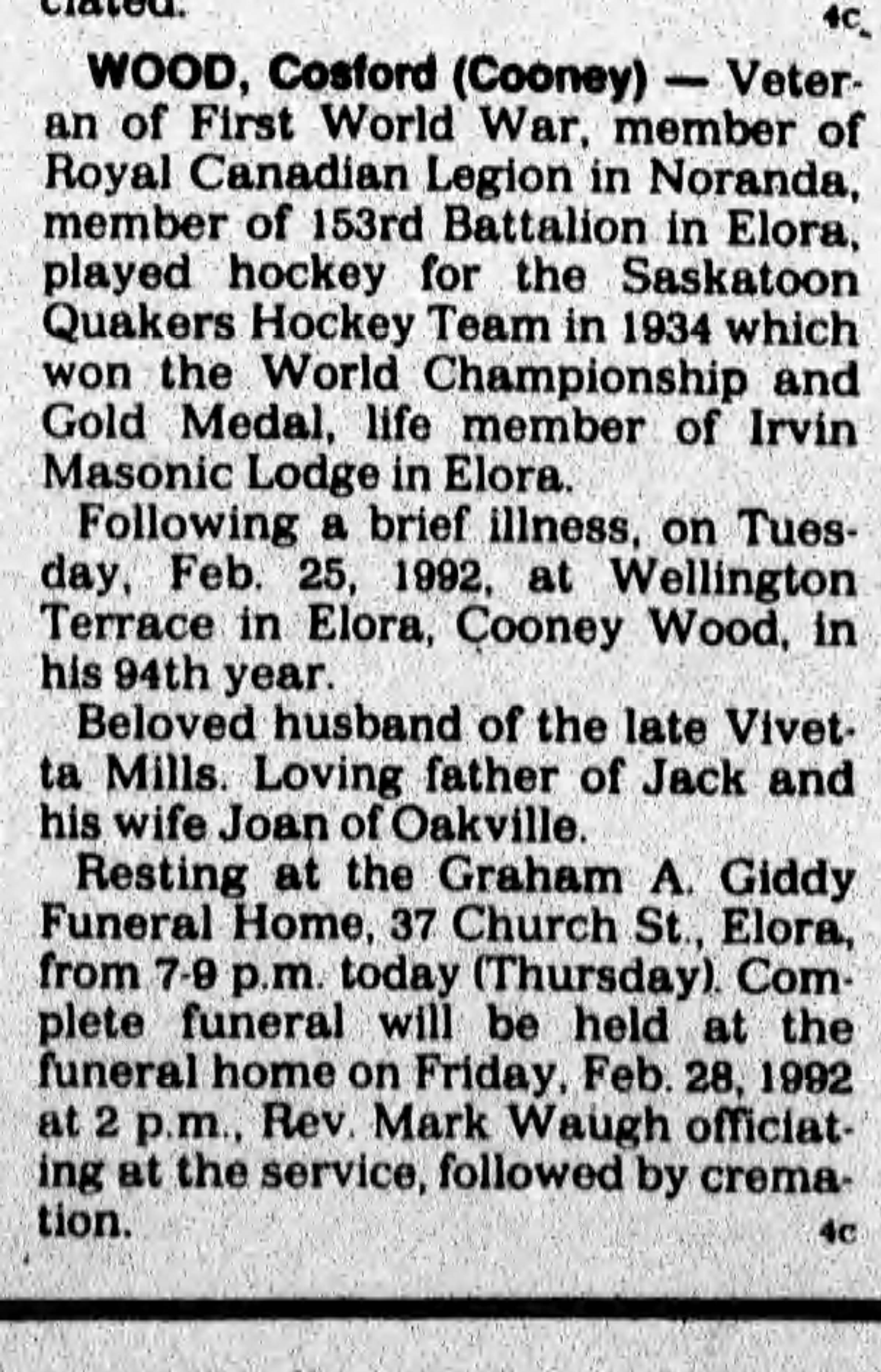 Cosford Reynold “Cooney” Wood (Woods) – Born October 15, 1897 (1899) in Salem (Elora), Ontario – Died February 28, 1992 in Elora, Ontario was a Canadian ice Hockey goaltender.