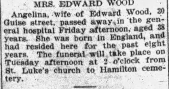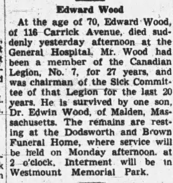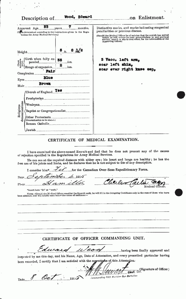 Family Search: When Private Edward Wood was born on 31 January 1877, in Ashton Under Lyne, Lancashire, England, United Kingdom, his father, John Wood, was 35 and his mother, Rosina Bailey, was 35. He married Angelina Wood on 21 March 1898, in Portwood, Cheshire, England, United Kingdom. They were the parents of at least 3 sons and 1 daughter. He lived in Portwood, Cheshire, England, United Kingdom in 1898 and Hamilton, Ontario, Canada in 1911. He registered for military service in 1915. In 1915, at the age of 38, his occupation is listed as mill wright in Hamilton, Wentworth, Ontario, Canada. He died on 14 May 1948, in Hamilton, Wentworth, Ontario, Canada, at the age of 71, and was buried in White Chapel Memorial Gardens, Hamilton, Ontario, Canada.