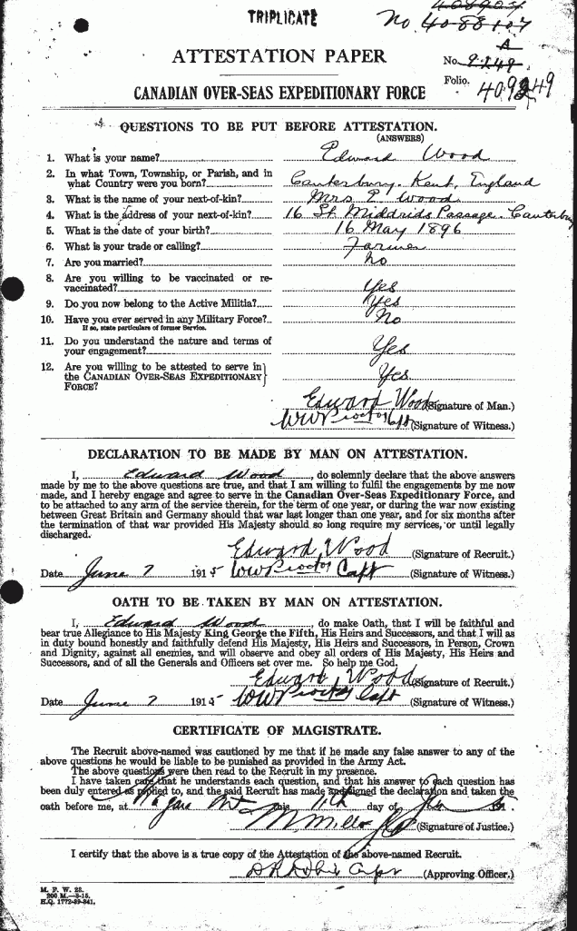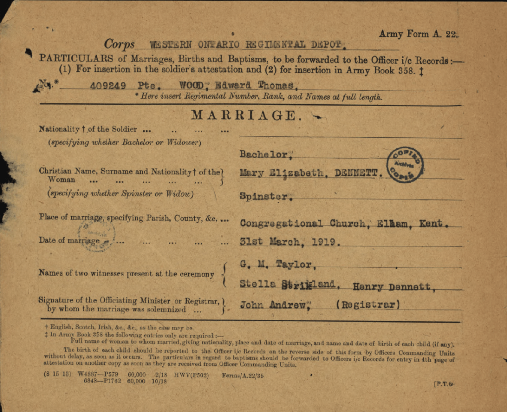 Family Search: When Private Edward Thomas Wood was born on 16 May 1896, in Canterbury, Kent, England, United Kingdom, his father, James Wood, was 37 and his mother, Emma Gimber, was 33. He married Mary Elizabeth Dennett on 31 March 1919, in Elham, Kent, England, United Kingdom. They were the parents of at least 2 sons. He immigrated to Halifax, Nova Scotia, Canada in 1911 and lived in Toronto, York, Ontario, Canada in 1939 and Oshawa, Ontario, Ontario, Canada in 1958. He registered for military service in 1915. In 1939, at the age of 43, his occupation is listed as soldier, veterans guard and painter in Toronto, York, Ontario, Canada. He died on 25 March 1958, at the age of 61, and was buried in York Cemetery, Toronto, Ontario, Canada.