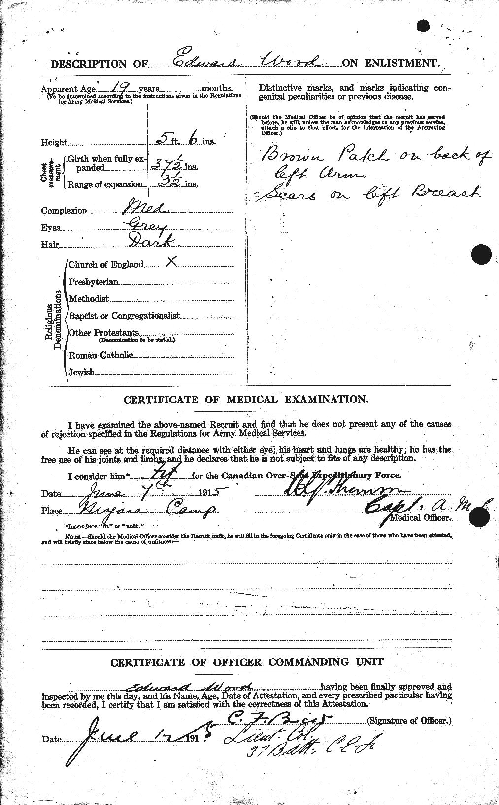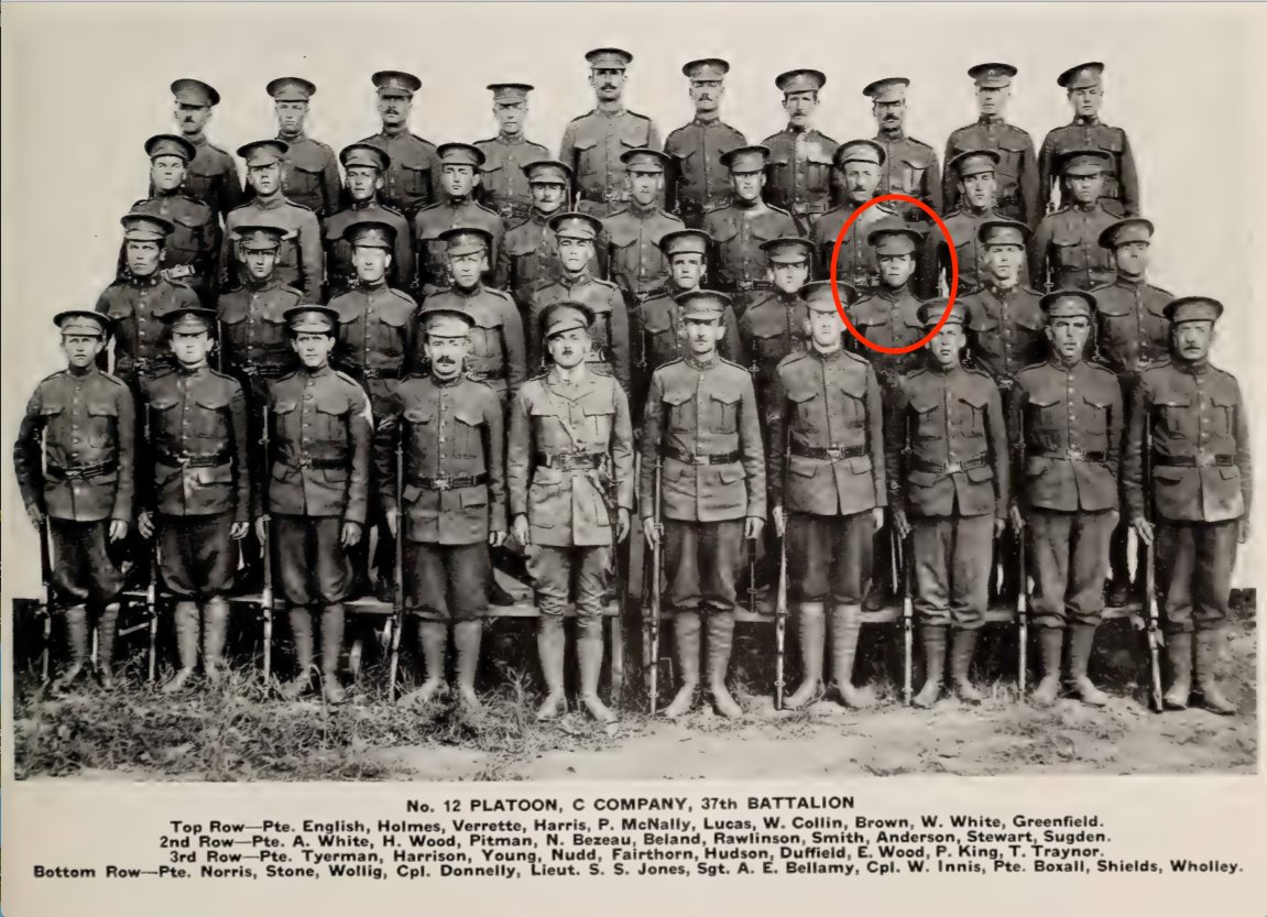 This man enlisted with the 37th Battalion at Niagara Camp, Niagara-on-the-Lake on 10 June 1915. He was a single farmer by trade and had belonged to the Canadian Militia prior to his enlistment.