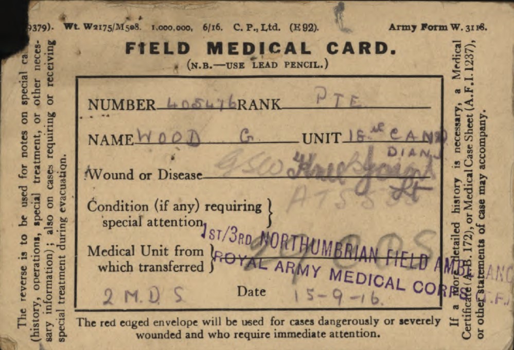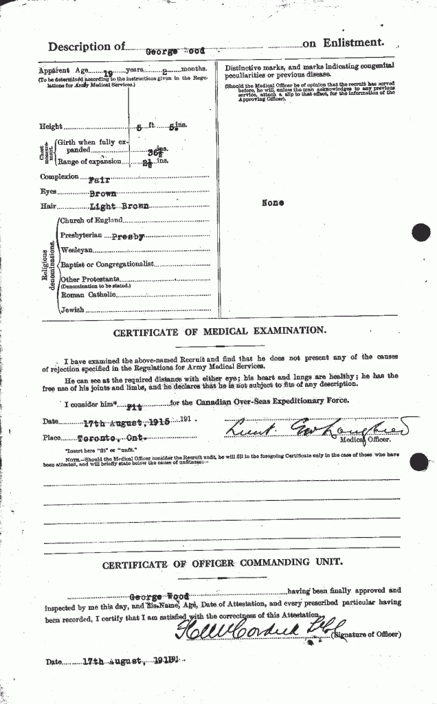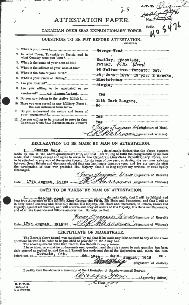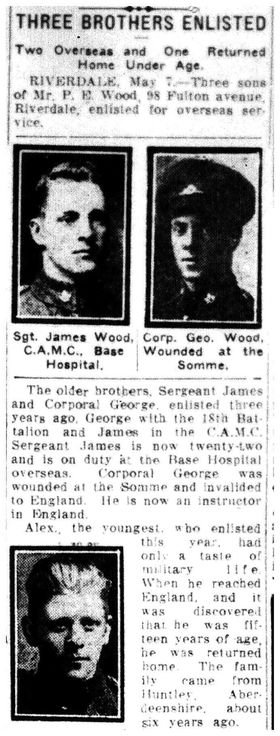 Wood, George: Service no. 405476. Source: Toronto Telegram. May 1918. Per news clipping post by David Archer at 18th Battalion Facebook Page (not group).
