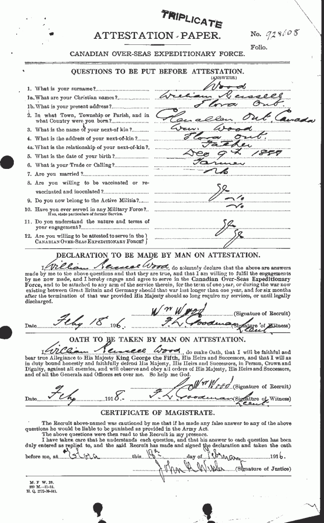 Trade listed as Farmer. DOB 9-12-88, born Glen Allen. Ontario. 5 foot 10 inches. Grey eyes, fair hair. Presbyterian. NOK William Wood, father. Elizabeth Wood, mother). (brother 928064 Cosford Wood) Enlisted Elora 18-2-16 (age 27 years). On 153rd Battalion Nominal Roll 26-2-16, no transfer noted. On 153rd Nominal Rolls as published Guelph Mercury 10-6-16 and 1-12-16. Embarked with 153rd Halifax N.S. SS Olympic 29-4-17. Arrived Liverpool 7-5-17. Assigned 25th Reserve for Training and Administration. Taken on Strength 18th Battalion 14-12-17. GSW right thigh 9-8-18. Globe & Mail Casualty List 22-8-18 reports “wounded.” Returned to Canada aboard SS Caronia, Halifax N.S. 22-5-19. Demobilized London 24-5-19. Died 23-5-53, Zehner, Sasakatchewan.