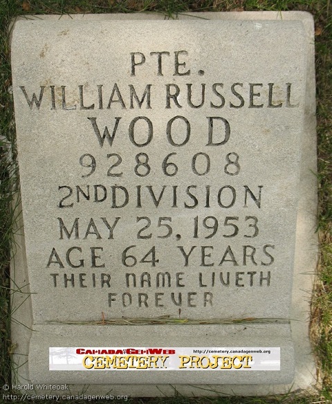 Family Search: When Private William Russell Wood was born on 8 December 1887, in Maryborough Township, Wellington, Ontario, Canada, his father, William James Wood, was 34 and his mother, Elizabeth Cosford, was 31. He had at least 1 son with Agnes Kirl. He lived in Wellington, Ontario, Canada in 1901. He registered for military service in 1916. In 1916, at the age of 29, his occupation is listed as farmer. He died on 25 May 1953, in Regina, Saskatchewan, Canada, at the age of 65, and was buried in Regina Cemetery, Regina, Saskatchewan, Canada.