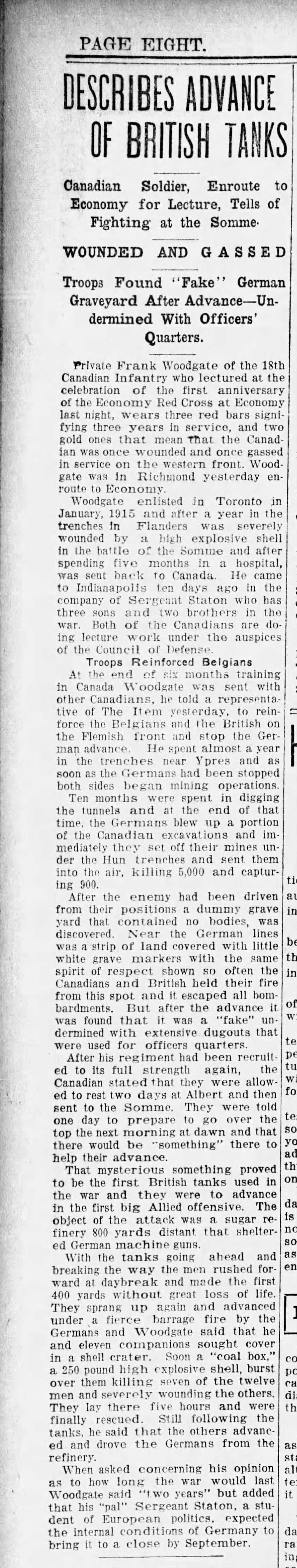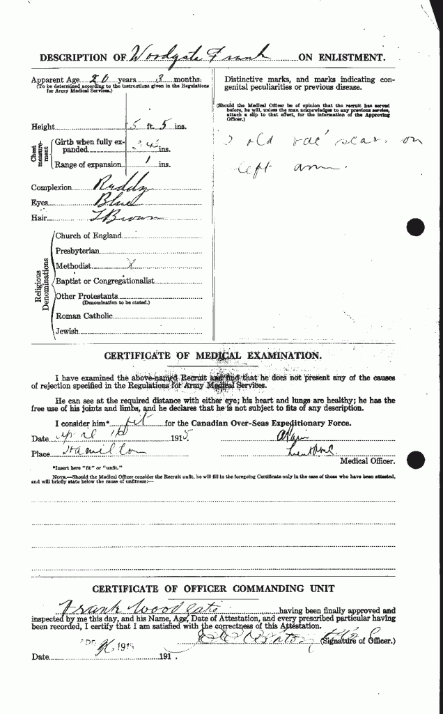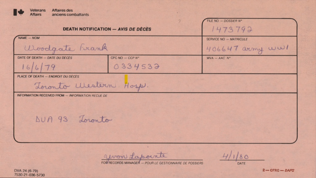 Family Search: When Private Frank Woodgate was born on 17 January 1895, in Winchester, Hampshire, England, United Kingdom, his father, Arthur Davis Woodgate, was 23 and his mother, Emma Jane Carrod, was 16. He had at least 1 daughter with Edith Winnifred. He immigrated to Vermont, United States in 1919 and lived in Stamford, Welland, Ontario, Canada in 1931. He registered for military service in 1916. In 1916, at the age of 21, his occupation is listed as chauffeur. He died on 16 June 1979, in Toronto, Ontario, Canada, at the age of 84, and was buried in Prospect Cemetery, Toronto, Ontario, Canada.