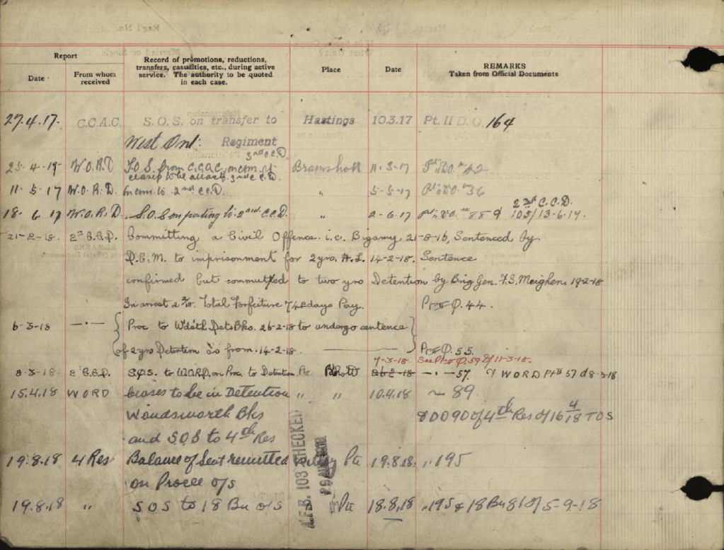 This soldier was a bigamist. Sentenced to 2-years hard labour but had his sentence commuted and he returned to the 18th to fight again.