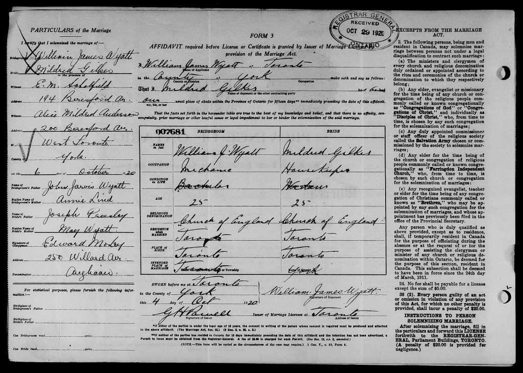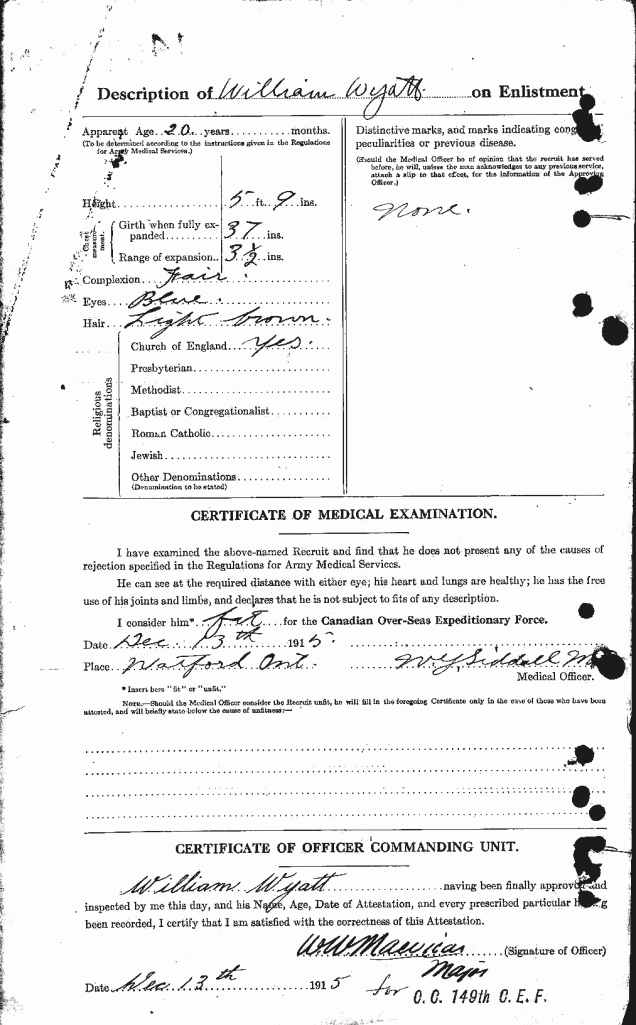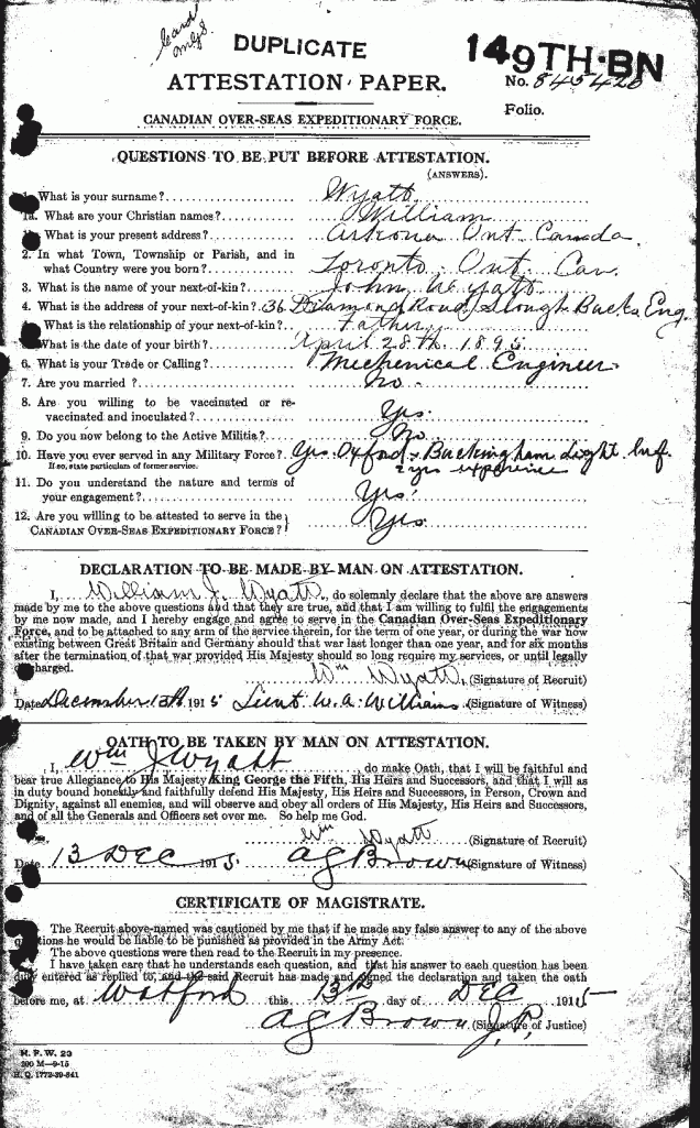 Family Search: When Private William James Wyatt was born on 29 April 1895, in Toronto, Ontario, Canada, his father, John Jarvis Wyatt, was 27 and his mother, Annie Lavinia Lind, was 25. He married Mildred Preedy on 4 October 1920, in Toronto, Ontario, Canada. They were the parents of at least 2 daughters. He lived in Vaughan, York, Ontario, Canada in 1931 and Thornhill, Vaughan, York, Ontario, Canada in 1968. He registered for military service in 1915. In 1915, at the age of 20, his occupation is listed as mechanical engineer. He died in 1968, in Simcoe, Ontario, Canada, at the age of 73, and was buried in Atherley Cemetery, Atherley, Durham, Ontario, Canada.