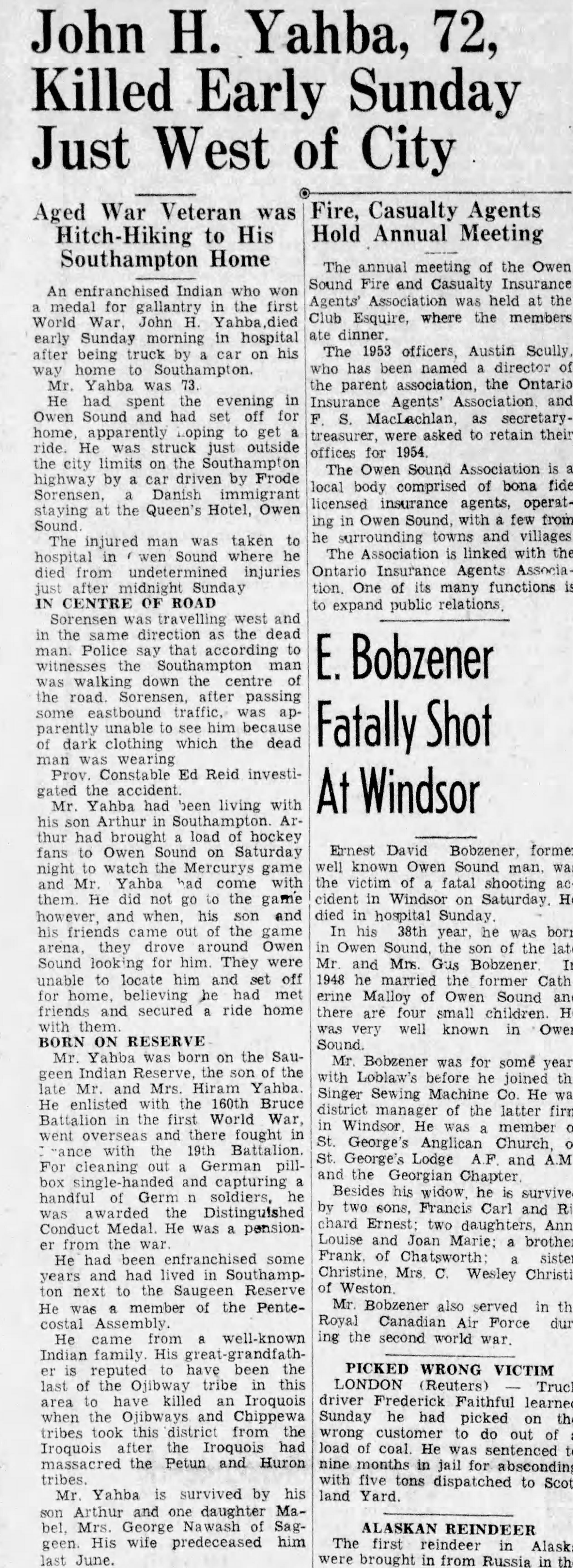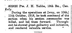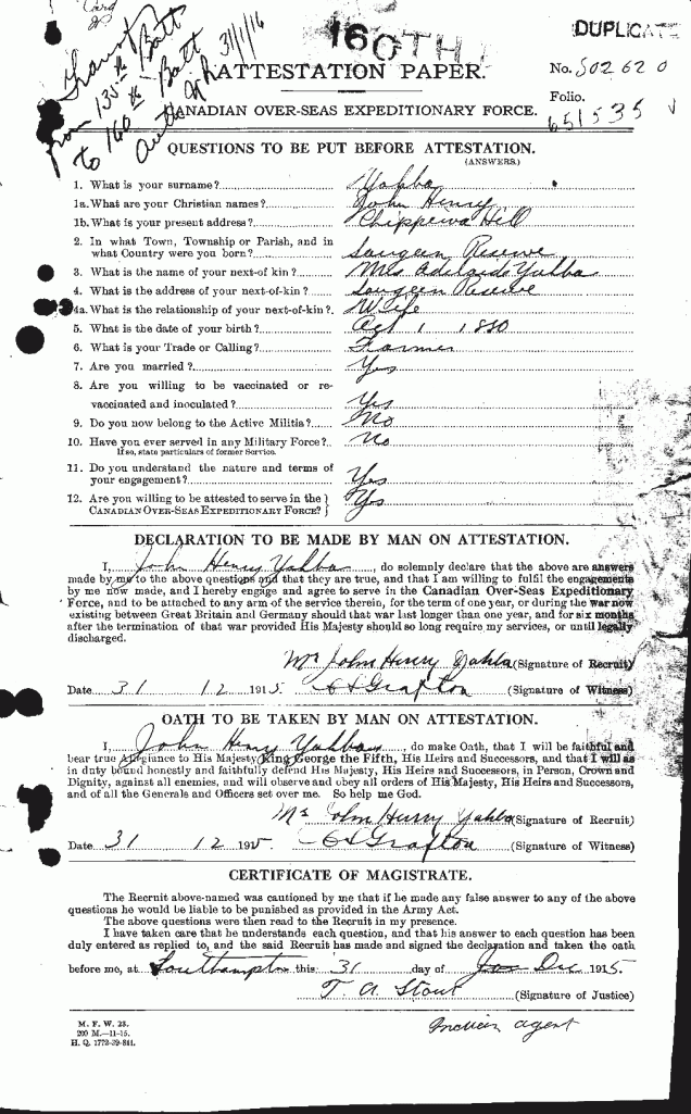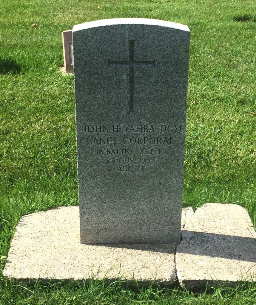 Family Search: When Lance-Corporal John Henry Yahba was born on 1 October 1880, in Saugeen 29, Bruce, Ontario, Canada, his father, Amos Yahba, was 24 and his mother, Kam Yahba, was 14. He had at least 1 son and 4 daughters with Annie Florence Adelaide Ritchie. He lived in Chippawa Hill, Saugeen 29, Bruce, Ontario, Canada in 1915. He registered for military service in 1915. In 1915, at the age of 35, his occupation is listed as farmer in Chippawa Hill, Saugeen 29, Bruce, Ontario, Canada. He died on 28 November 1953, in Owen Sound, Grey, Ontario, Canada, at the age of 73, and was buried in Southampton Cemetery, Southampton, Saugeen Shores, Bruce, Ontario, Canada.