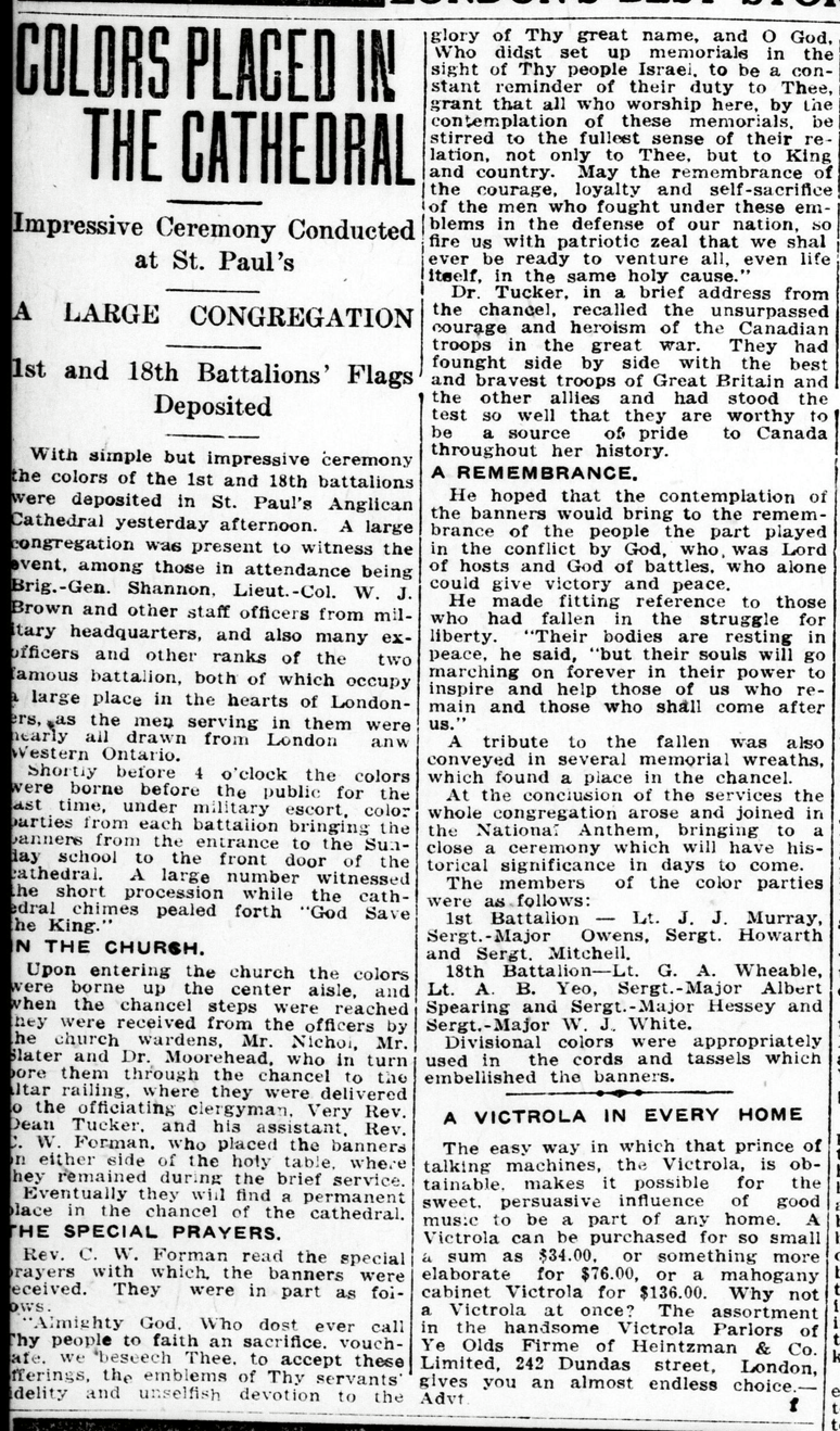 Family Search: When Lieutenant Augustus Beere Yeo was born on 23 October 1893, in London, England, United Kingdom, his father, Henry Yeo, was 33 and his mother, Annie Catherine Spencer Beere, was 25. He married Margaret Jane Wood on 7 March 1919, in London, Canada West, British North America. He immigrated to Canada in 1913 and lived in Stourton, Wiltshire, England, United Kingdom for about 10 years. He registered for military service in 1914. In 1914, at the age of 21, his occupation is listed as bank clerk in Berlin, Waterloo, Ontario, Canada. He died on 30 May 1950, in Detroit, Wayne, Michigan, United States, at the age of 56, and was buried in Woodland Cemetery, London, Ontario, Canada.
