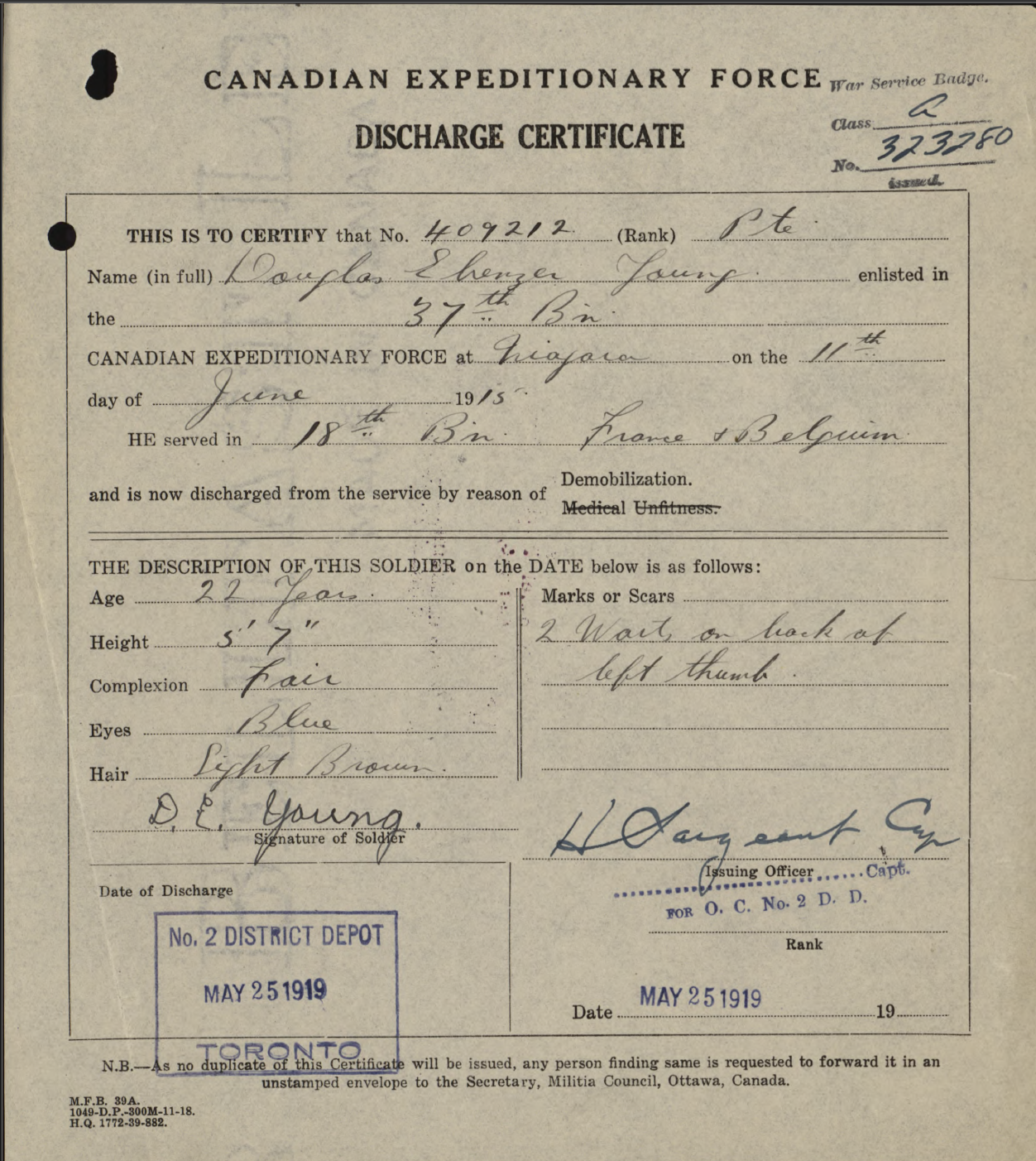 Family Search: When Private Douglas Ebenezer Young was born on 25 October 1896, in Derby Township, Grey, Ontario, Canada, his father, Ebenezer Oliver Young, was 35 and his mother, Emley Mccarthy, was 31. He lived in Grey, Ontario, Canada for about 10 years and Carling Township, Parry Sound, Ontario, Canada in 1919. He registered for military service in 1915. In 1915, at the age of 19, his occupation is listed as labourer.