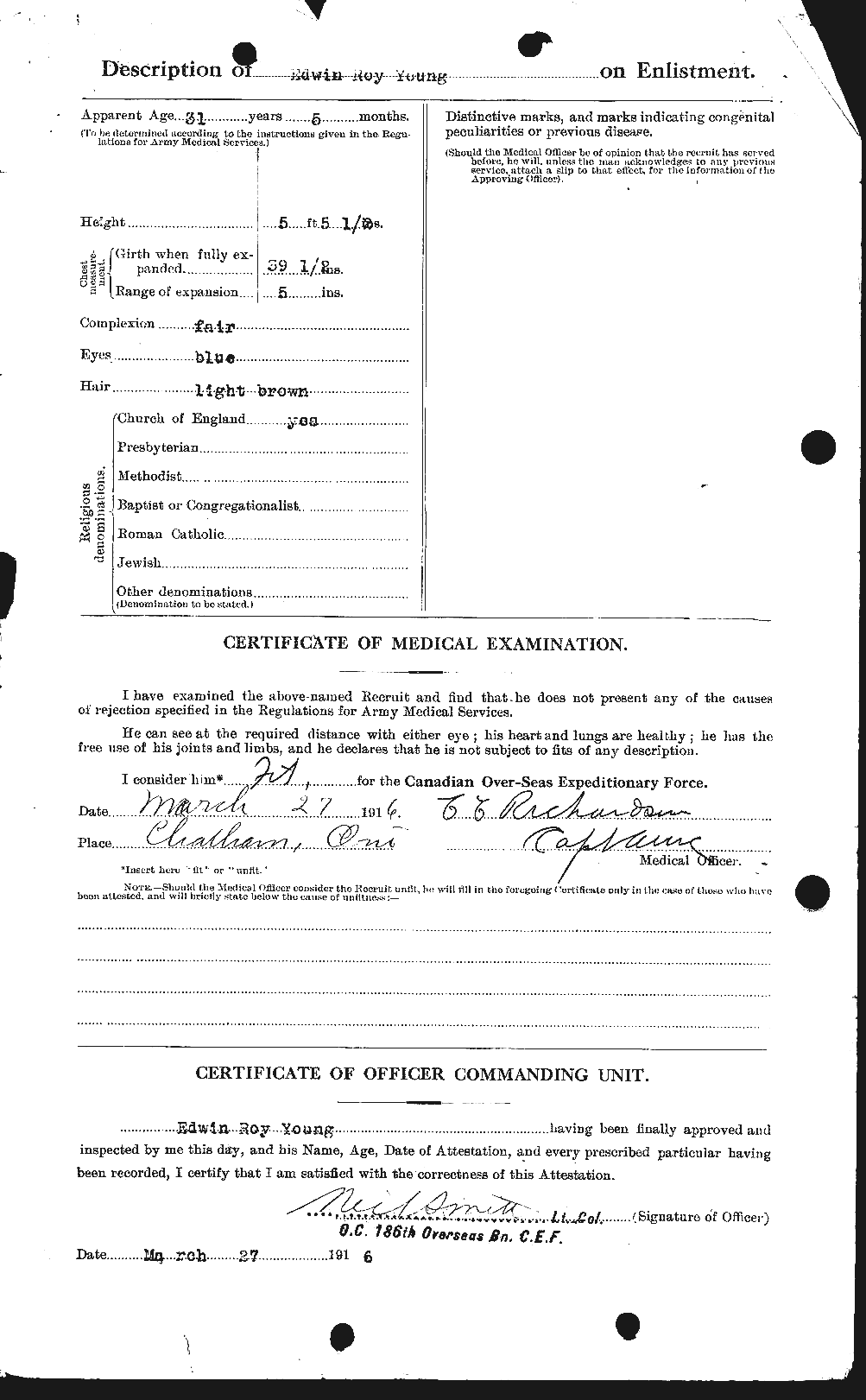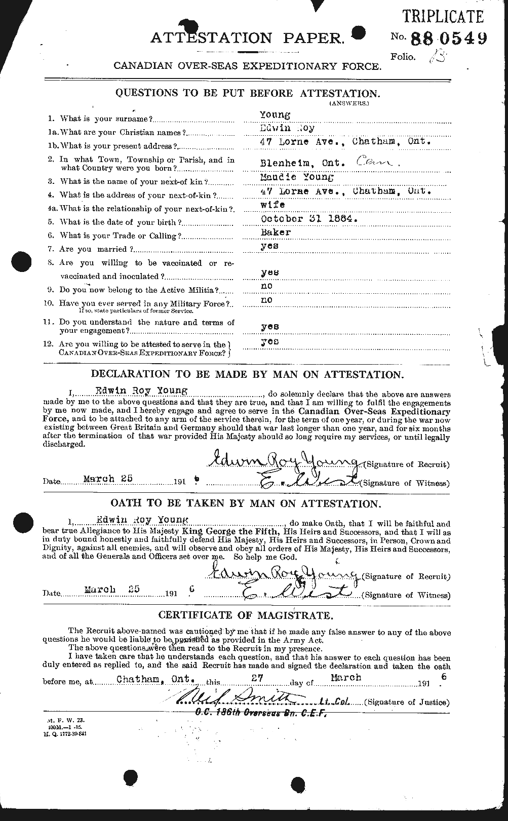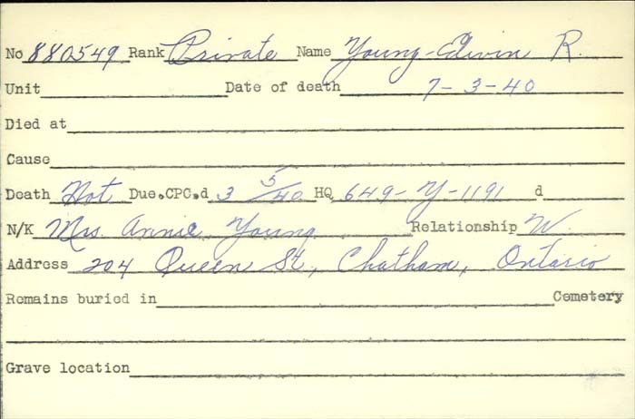 Family Search: When Private Edwin Roy Albert Young was born on 31 October 1884, in Blenheim, Kent, Ontario, Canada, his father, Alfred Edgar Young, was 40 and his mother, Mary Robinson Arrol, was 34. He had at least 2 sons and 1 daughter with Maud Austin. He lived in Kent, Georgian Highlands, Grey, Ontario, Canada in 1911 and Chatham, Kent, Ontario, Canada in 1916. He registered for military service in 1916. In 1916, at the age of 32, his occupation is listed as baker in Chatham, Kent, Ontario, Canada. He died on 7 March 1940, in Chatham, Chatham-Kent, Ontario, Canada, at the age of 55, and was buried in Maple Leaf Cemetery, Chatham, Chatham-Kent, Ontario, Canada.