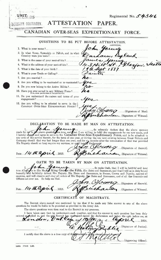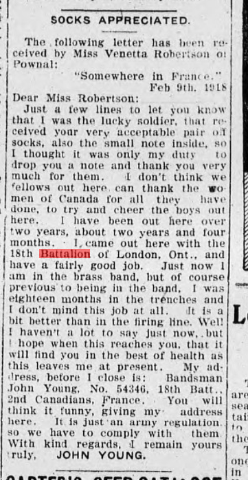 Young, John: Service no. 54346 Digitized Service Record Source: 18th Battalion Nominal Roll, April 1915. Find-A-Grave This soldier returned to Scotland after the war. Charlottetown Guardian. 27 March 1918. Page 2. Share this: Click to email a link to a friend (Opens in new window) Email Click to share on Facebook (Opens in new window) Facebook Click to share on X (Opens in new window) X Click to share on Reddit (Opens in new window) Reddit Click to share on LinkedIn (Opens in new window) LinkedIn Click to print (Opens in new window) Print Click to share on Tumblr (Opens in new window) Tumblr Click to share on Pocket (Opens in new window) Pocket Click to share on Pinterest (Opens in new window) Pinterest Click to share on Telegram (Opens in new window) Telegram Click to share on WhatsApp (Opens in new window) WhatsApp Like Loading...