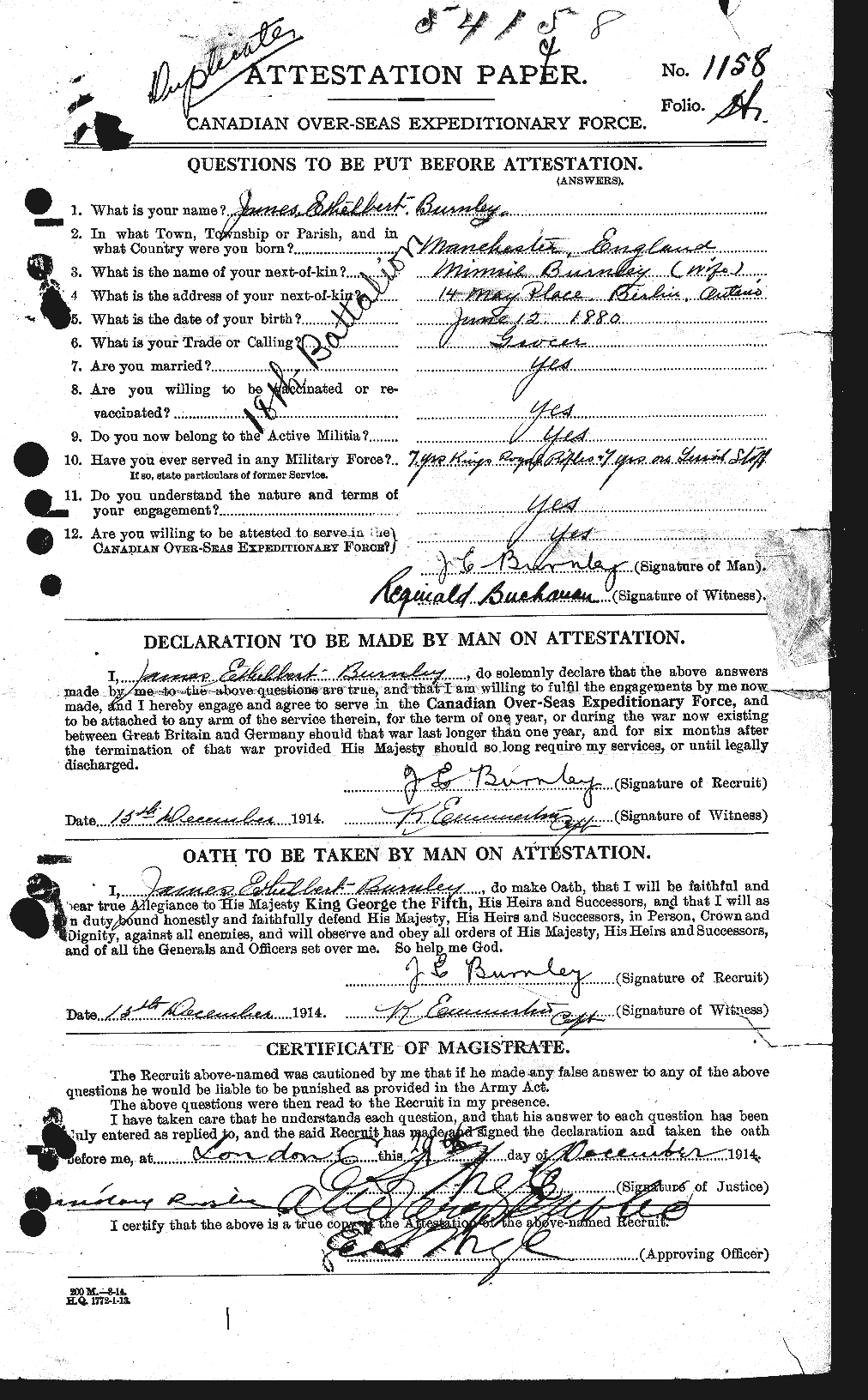 James Ethelbert Burnley was also known as Bert. He was born on 12 January 1880 at Manchester, England. He was the son of Walter Burnley and Fanny Jackson. While stationed in South Africa during the Boer war in 1902, Bert developed Phlebitis in his leg following Enteric Fever. James Ethelbert Burnley married Minnie A (?) circa 1910. James Ethelbert was a grocer in 1914 at London, Ontario. James Ethelbert and Minnie A were divorced after 15 December 1914. Bert enlisted in the Canadian Expeditionary Force. on 29 December 1914 at London, Ontario. James Ethelbert Burnley married Gladys Irene Foote, daughter of Fred Charles Foote and Mabel Louise Union, before 1935. Bert and Dot adopted Vernon Stiles in 1941. James Ethelbert Burnley died on 10 March 1969 at Oshawa, Ontario, Canada, at age 89.